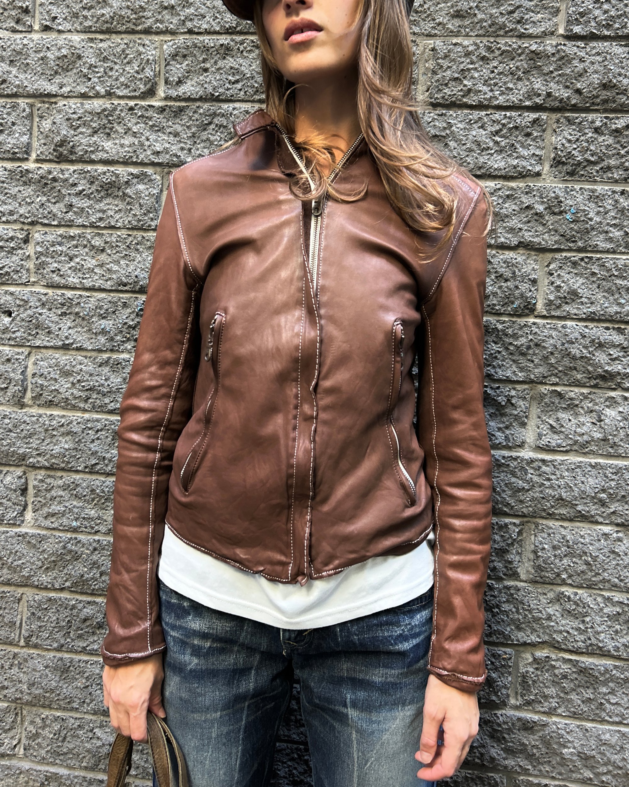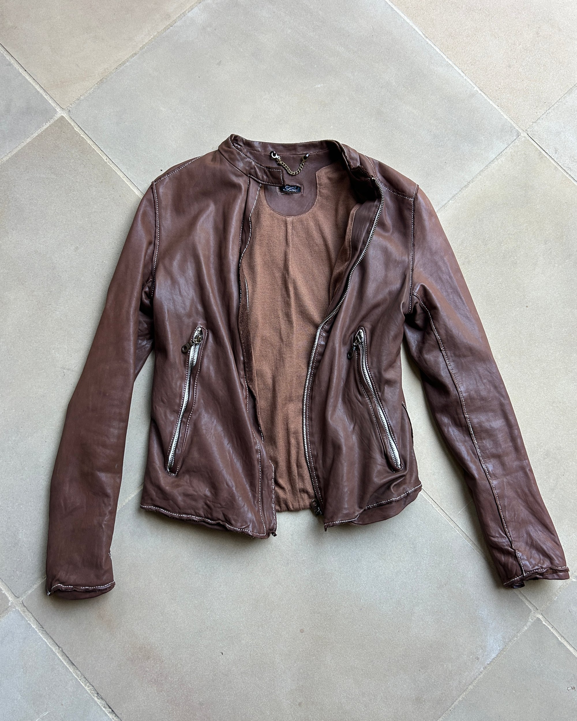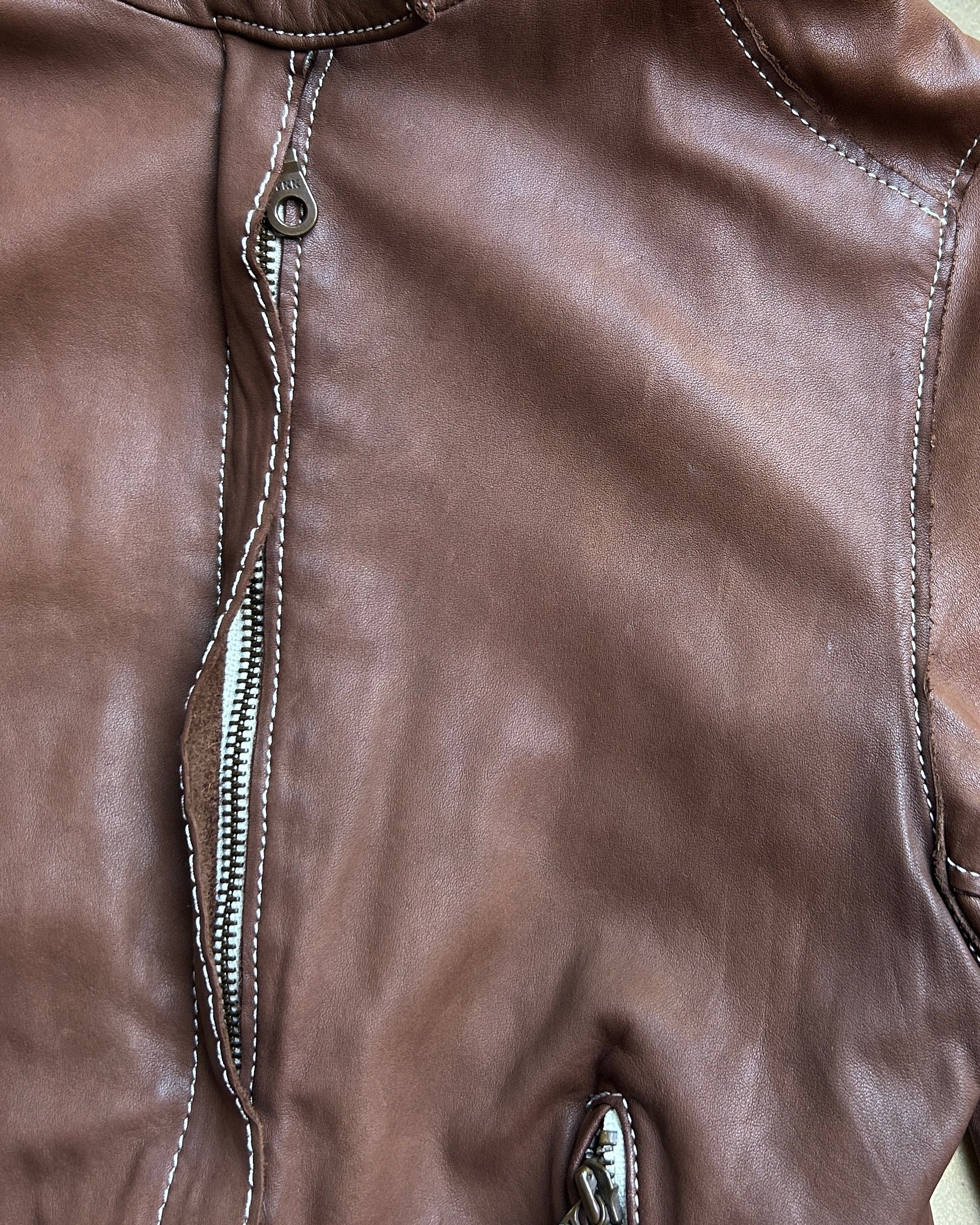 SIZE XS | Japanese brand buttery soft brown genuine leather jacket with contrast white stitch.