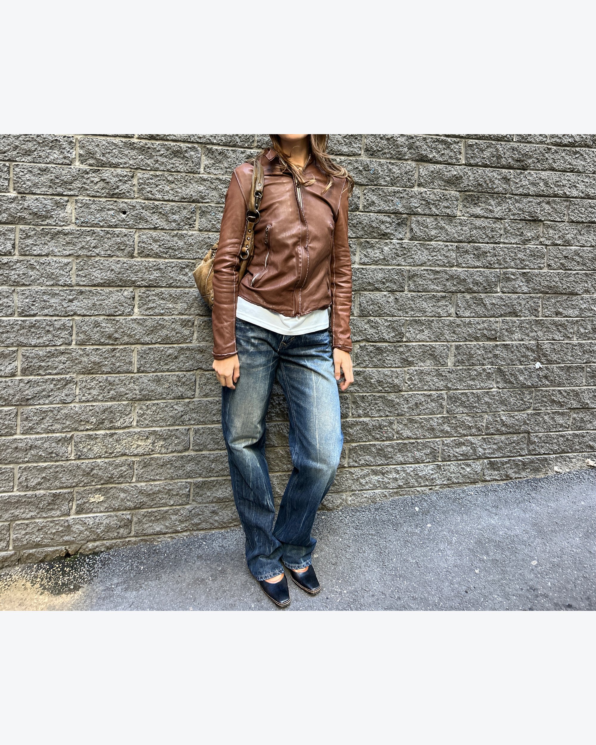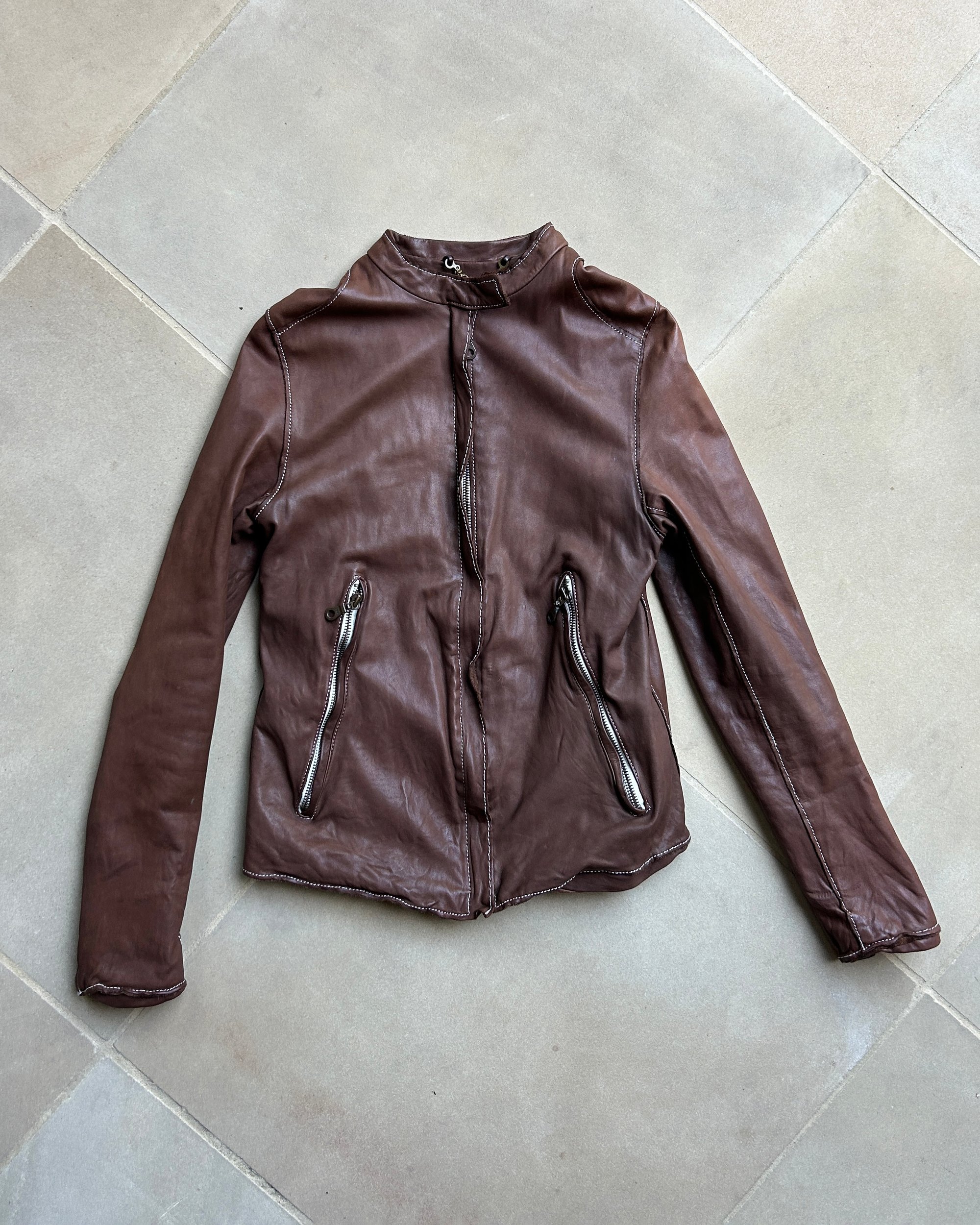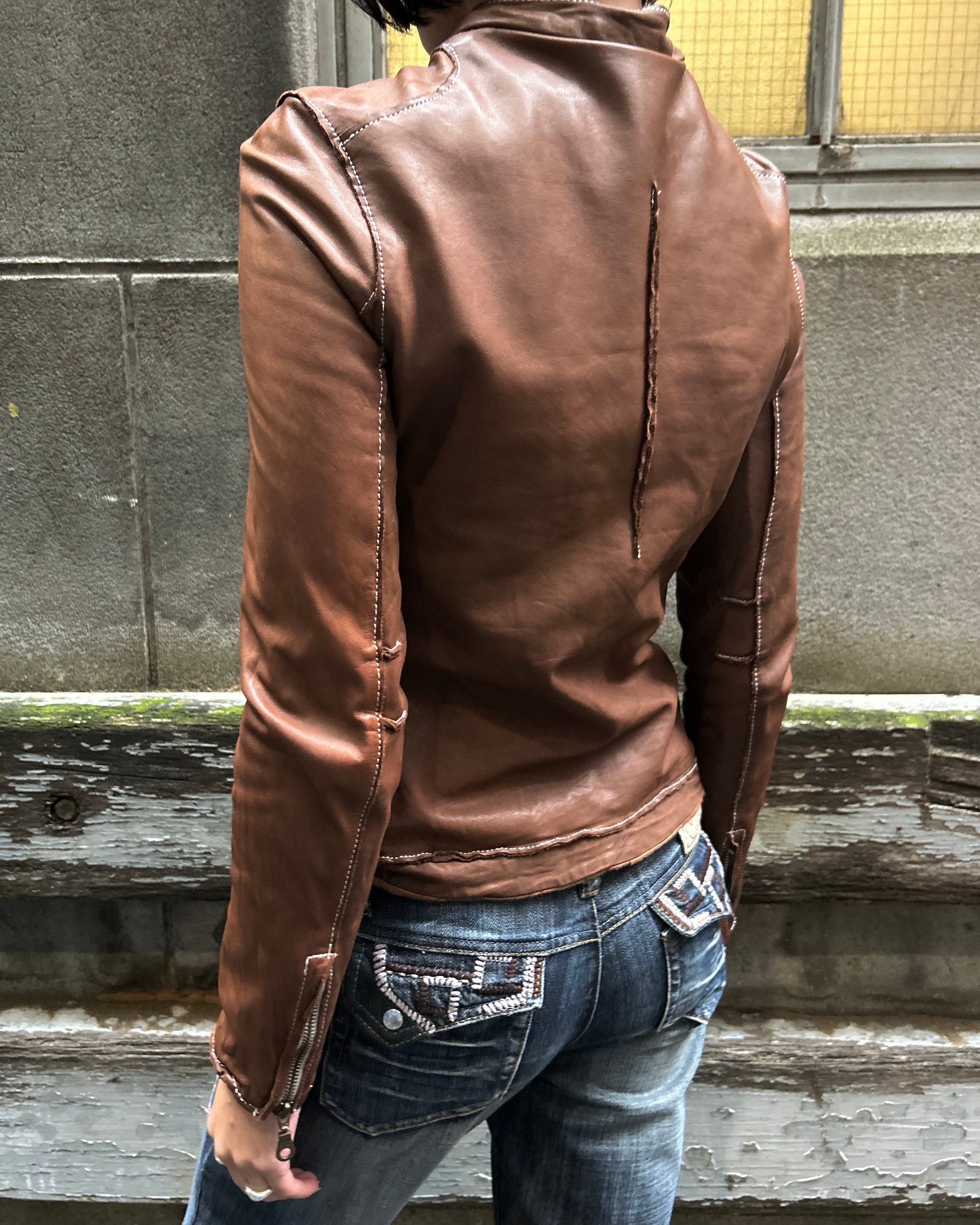 SIZE XS | Japanese brand buttery soft brown genuine leather jacket with contrast white stitch.