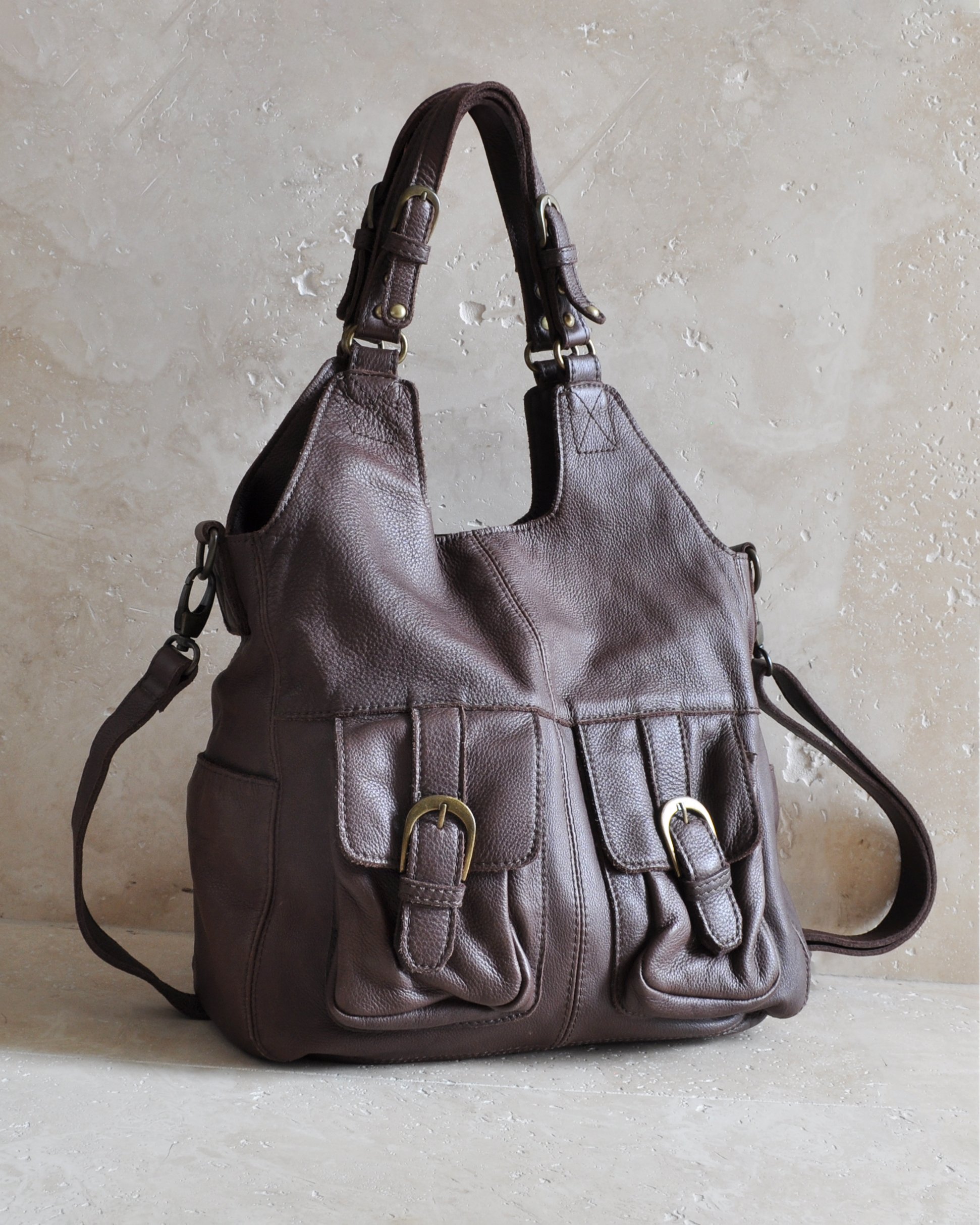 Two front pockets with magnetic buckles. One back pocket with zip closure. Magnetic closure at the opening of the bag. Three inner pocket compartments, one with a zip closure. Brown lining. Detachable and adjustable crossbody strap. Buckle detail on handles.