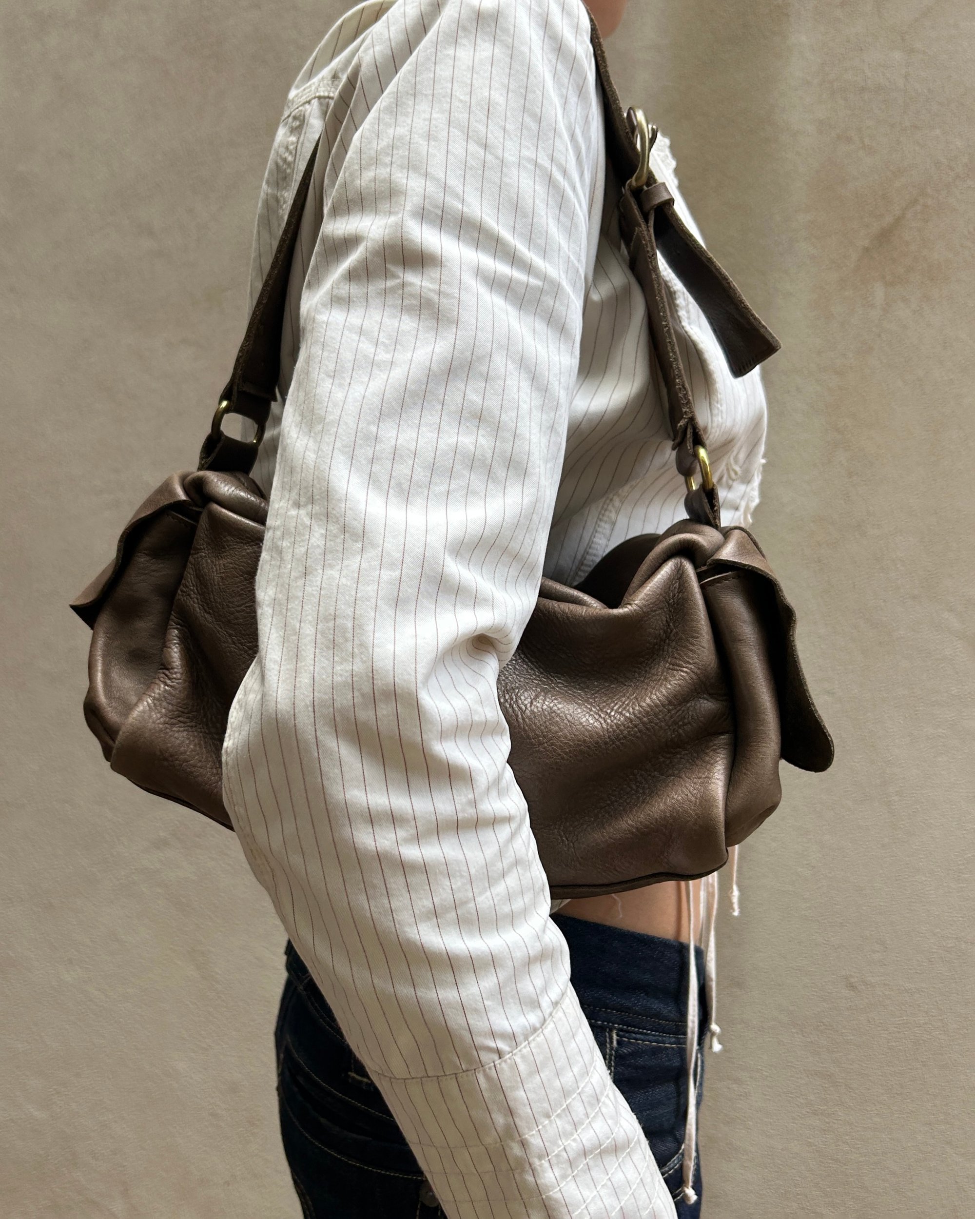LATTE/BROWN | Japanese label vintage genuine leather bag with muted gold hardware.