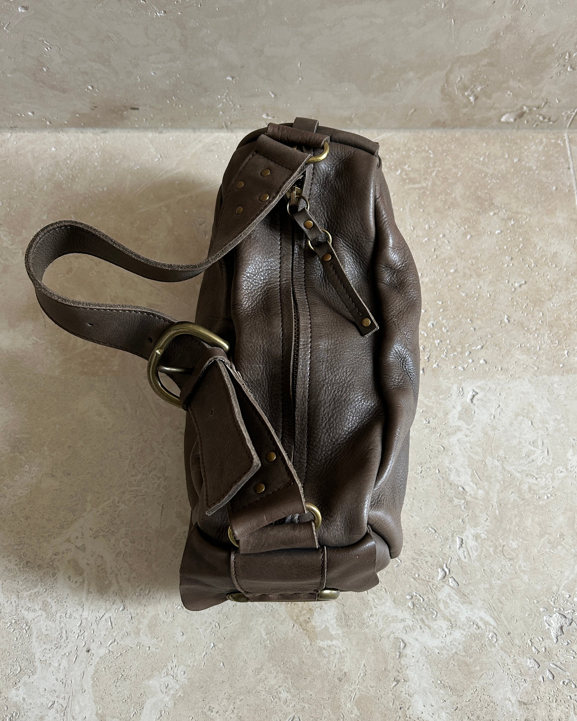 Soft distressed genuine leather. Zip closure. Two outer side pockets. Adjustable handle. Three inner pocket compartments, one with a zip closure. Brown lining.