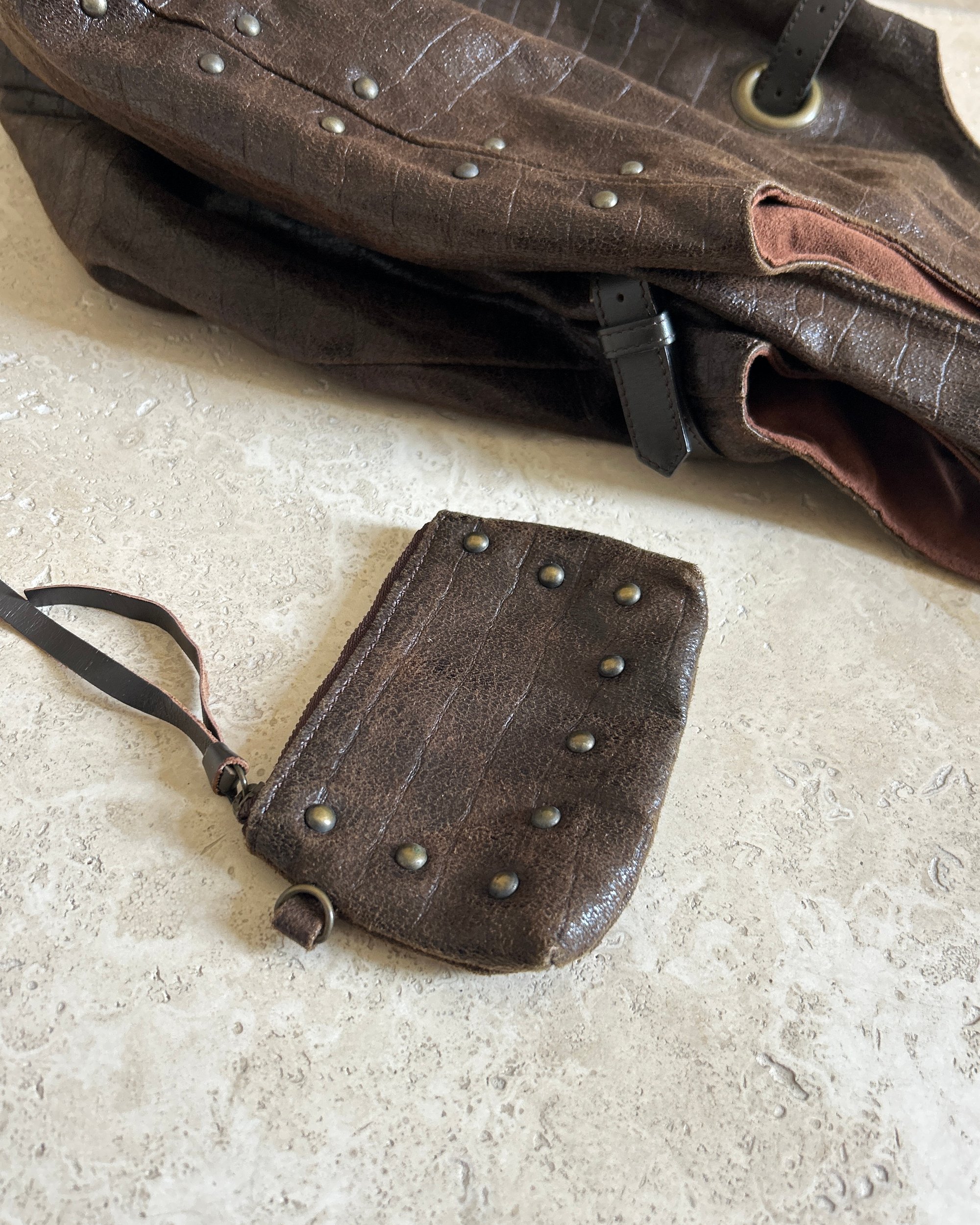 Coated brown fabric to create a croc leather-look. Antique gold hardware. Comes with a matching coin purse. Brown lining.