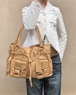 LIGHT CARAMEL | Vintage Japanese brand genuine leather bag with large buckle pockets and drawstring detail.