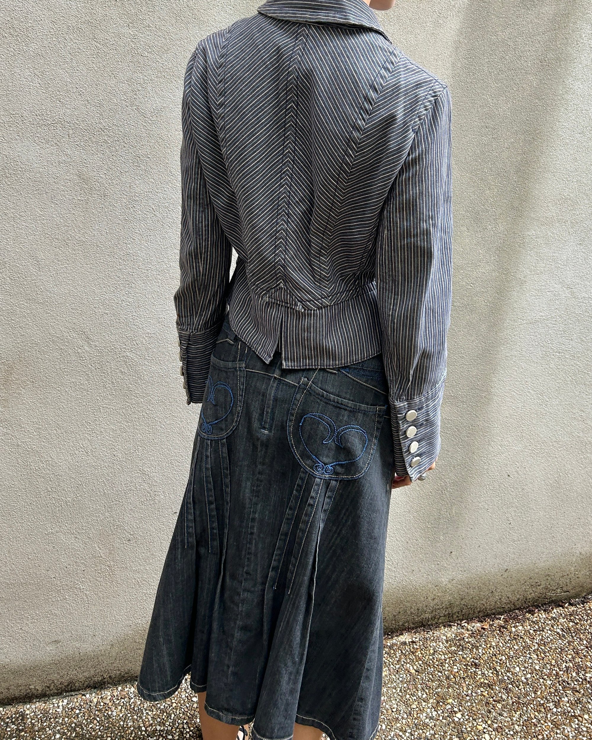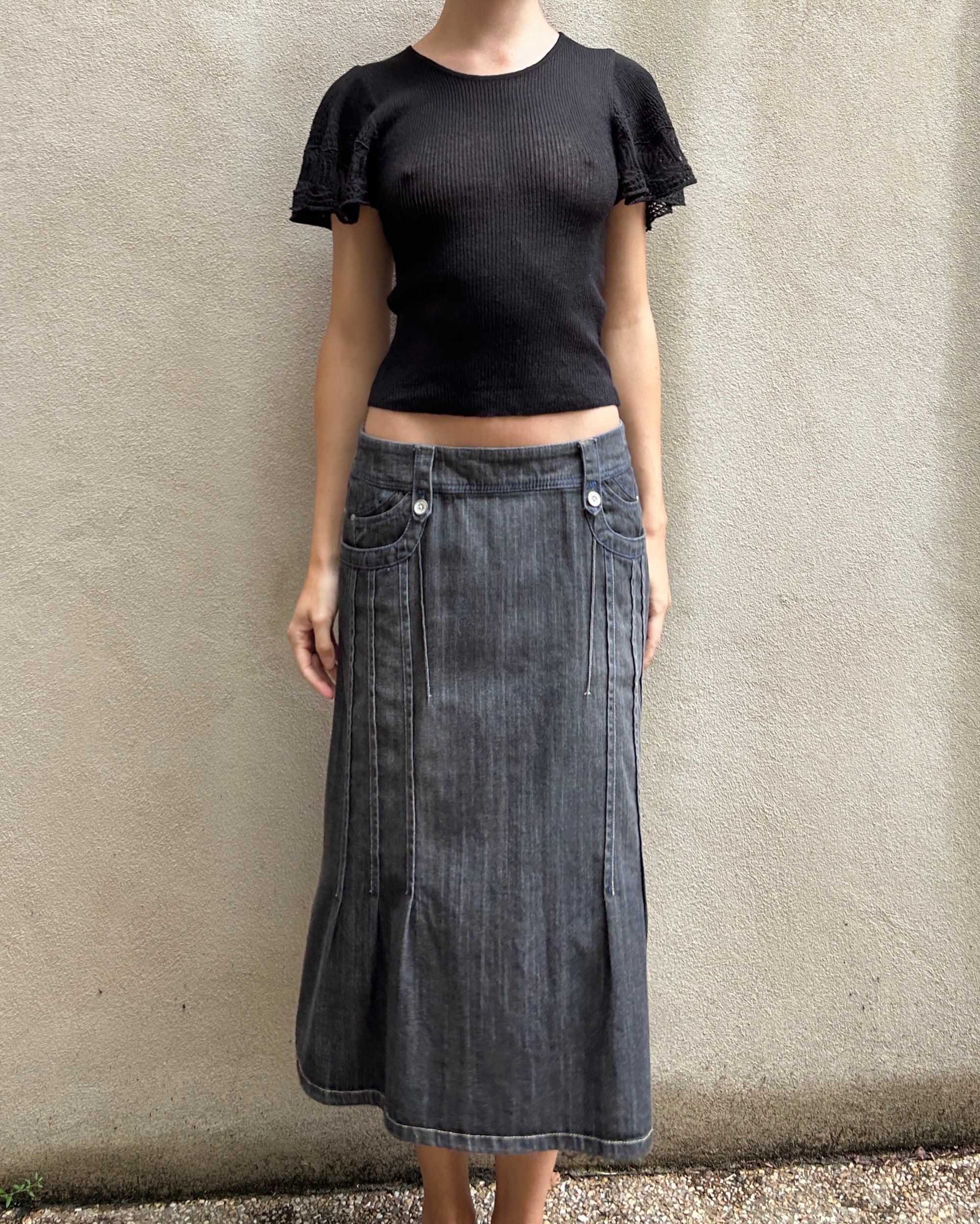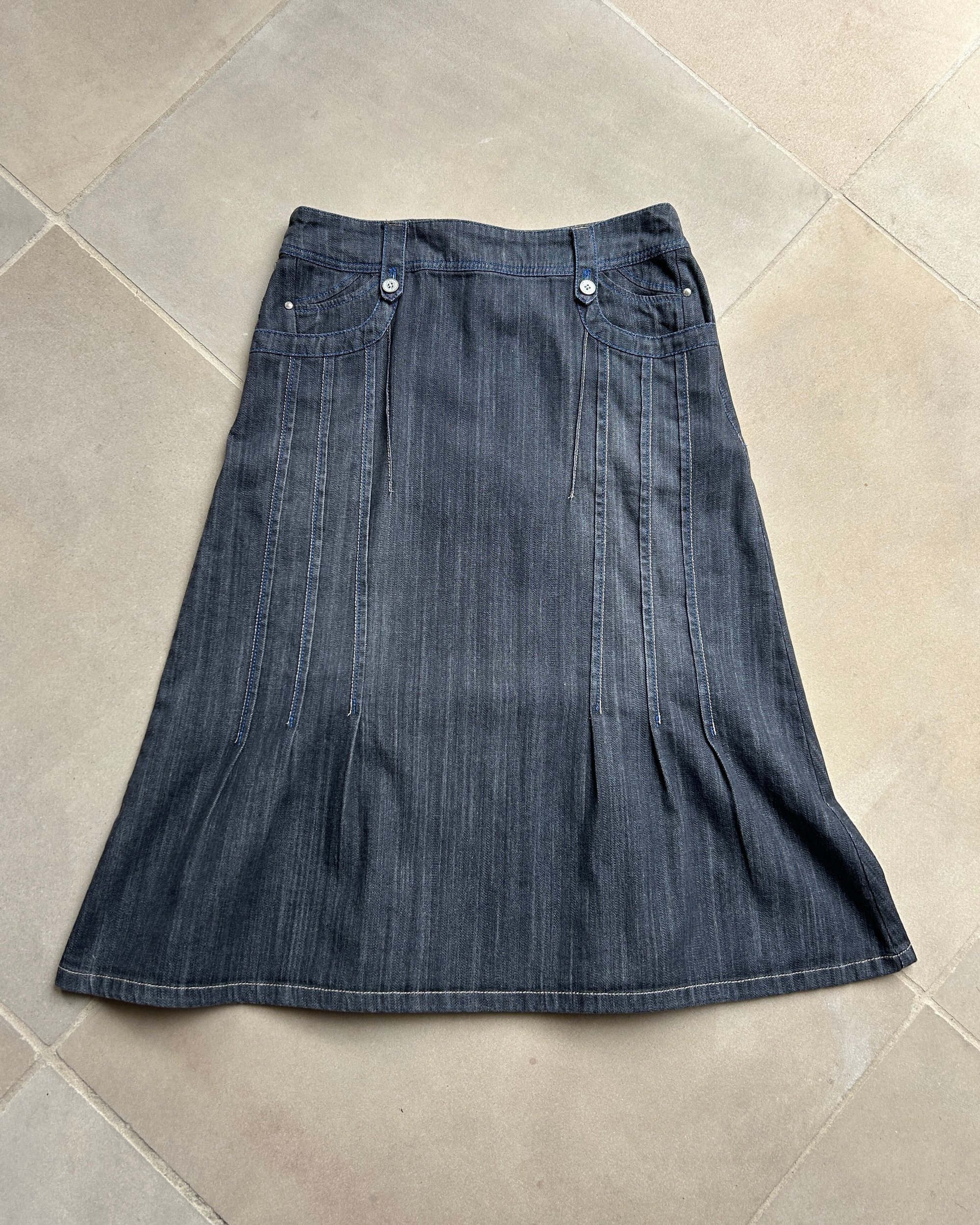 SIZE 40 | Vintage Japanese brand denim midi skirt with contrast stitch details.