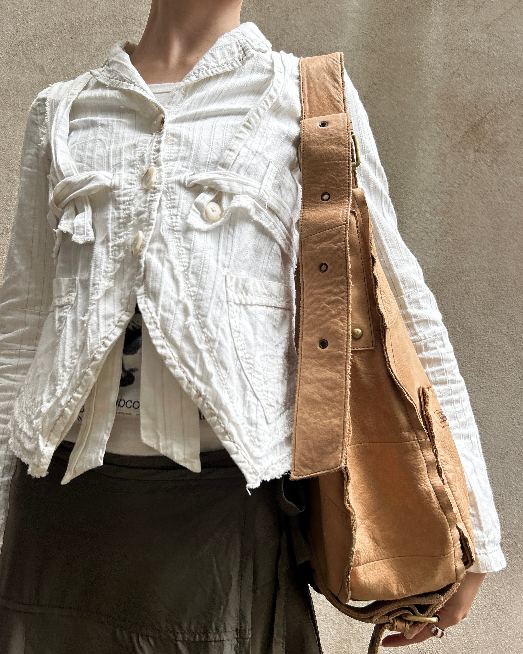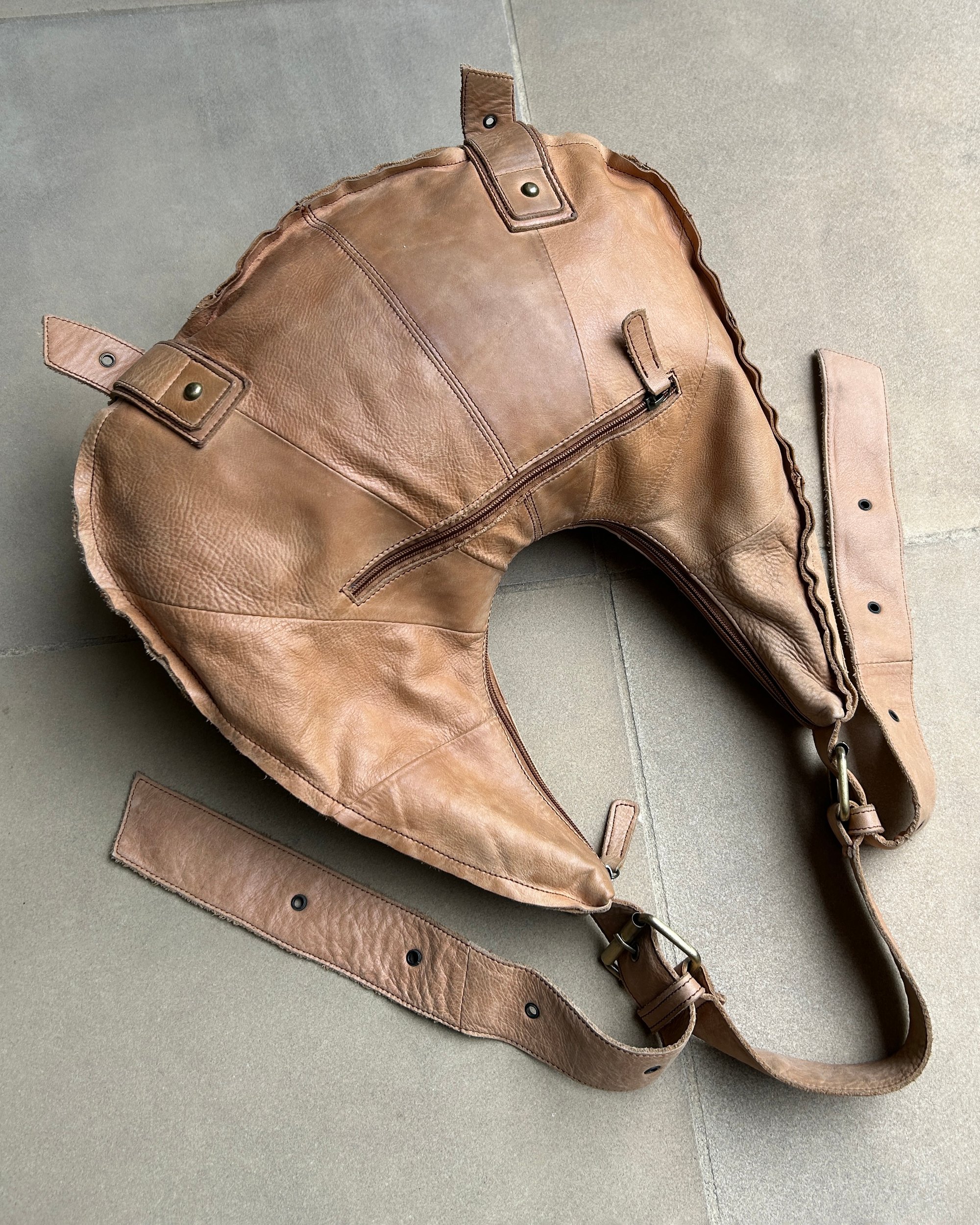 Soft distressed genuine leather. Zip closure. Two external front pockets. One external back pocket. Strap can be adjusted to be worn on the shoulder, or crossbody.