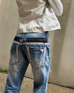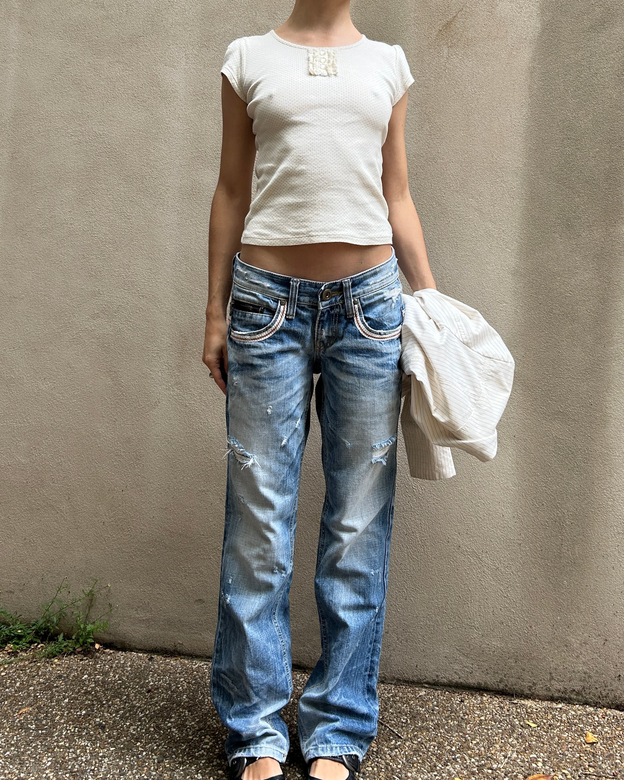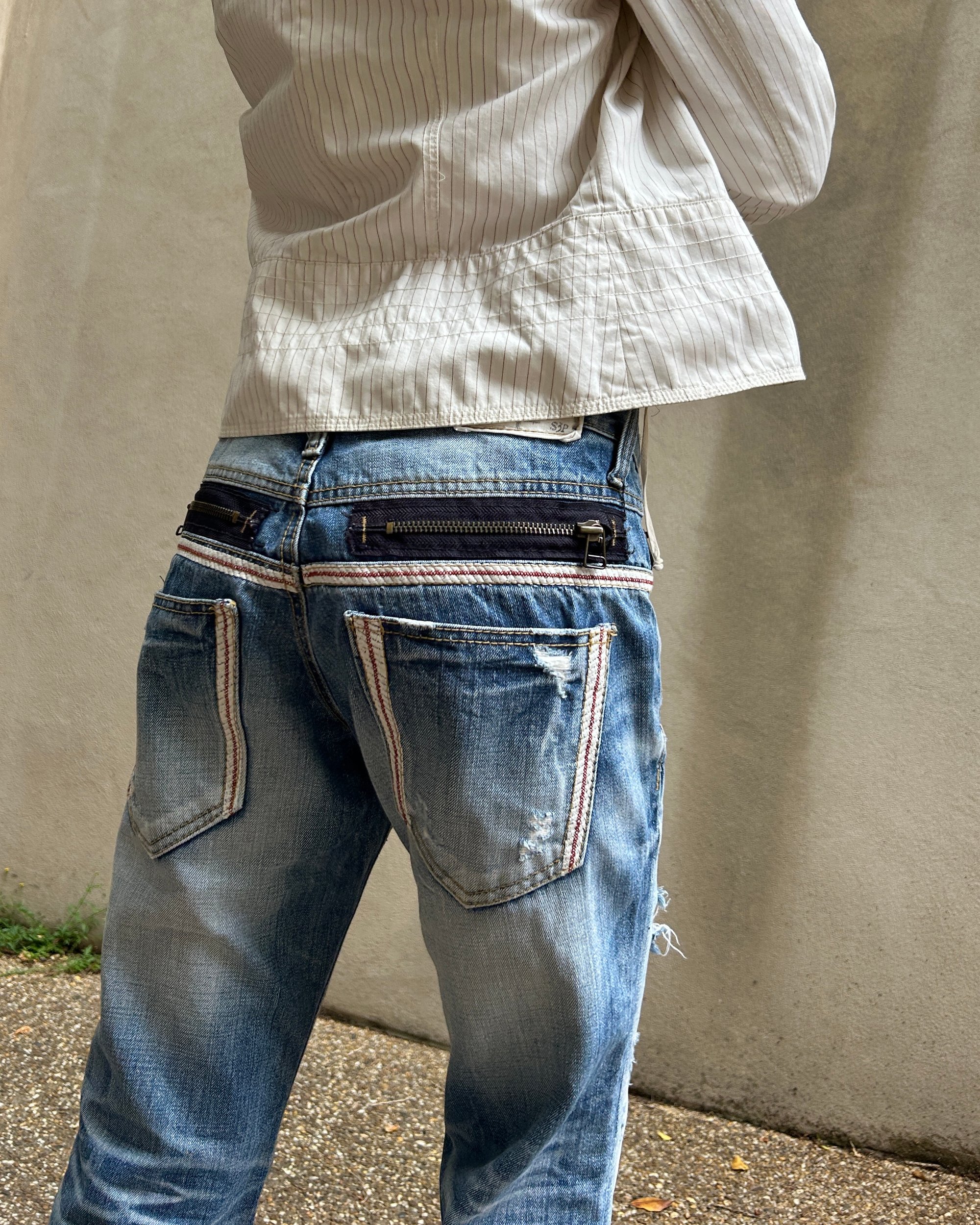 SIZE S/M | Vintage distressed jeans with contrast red & white stitch and zip detail.