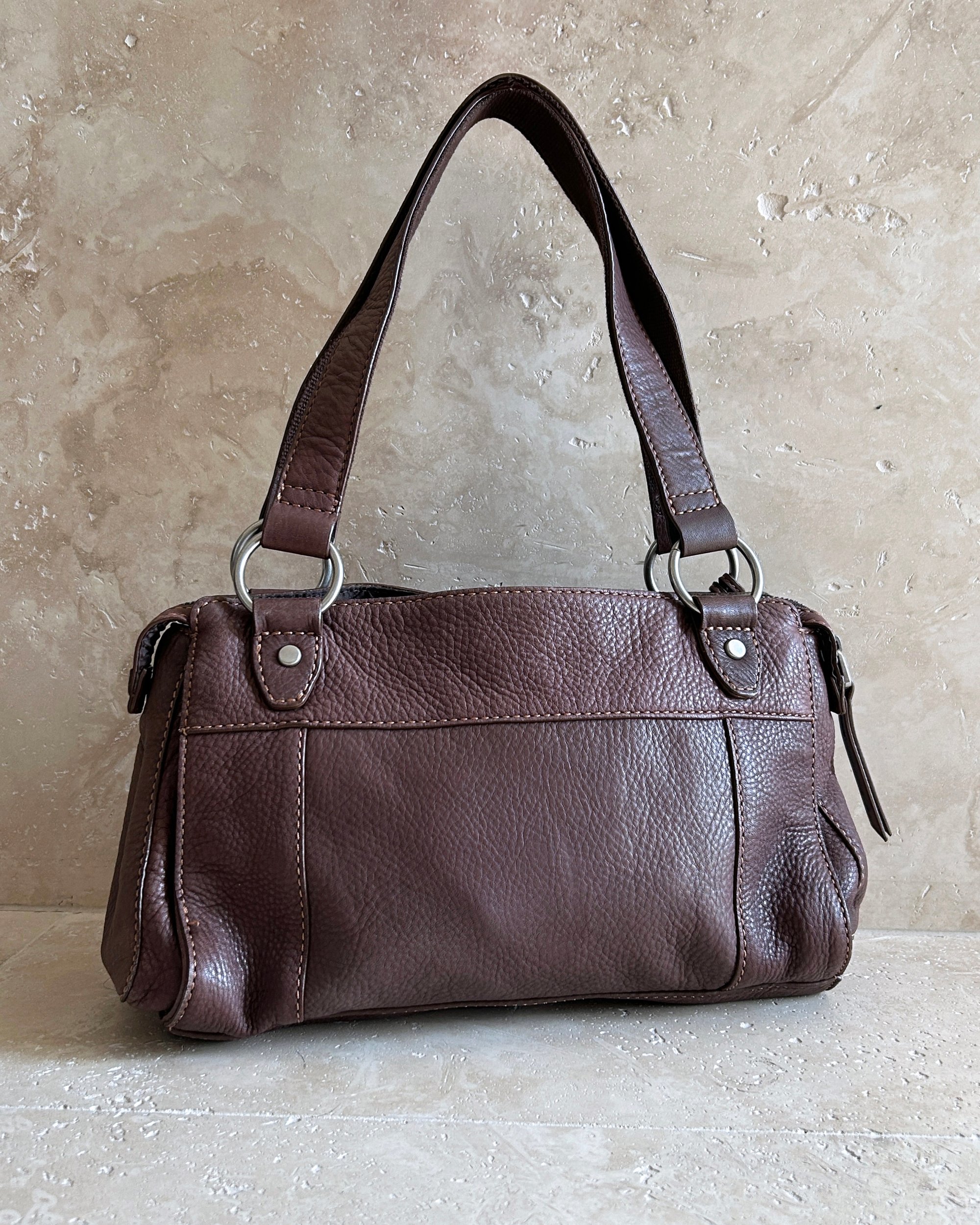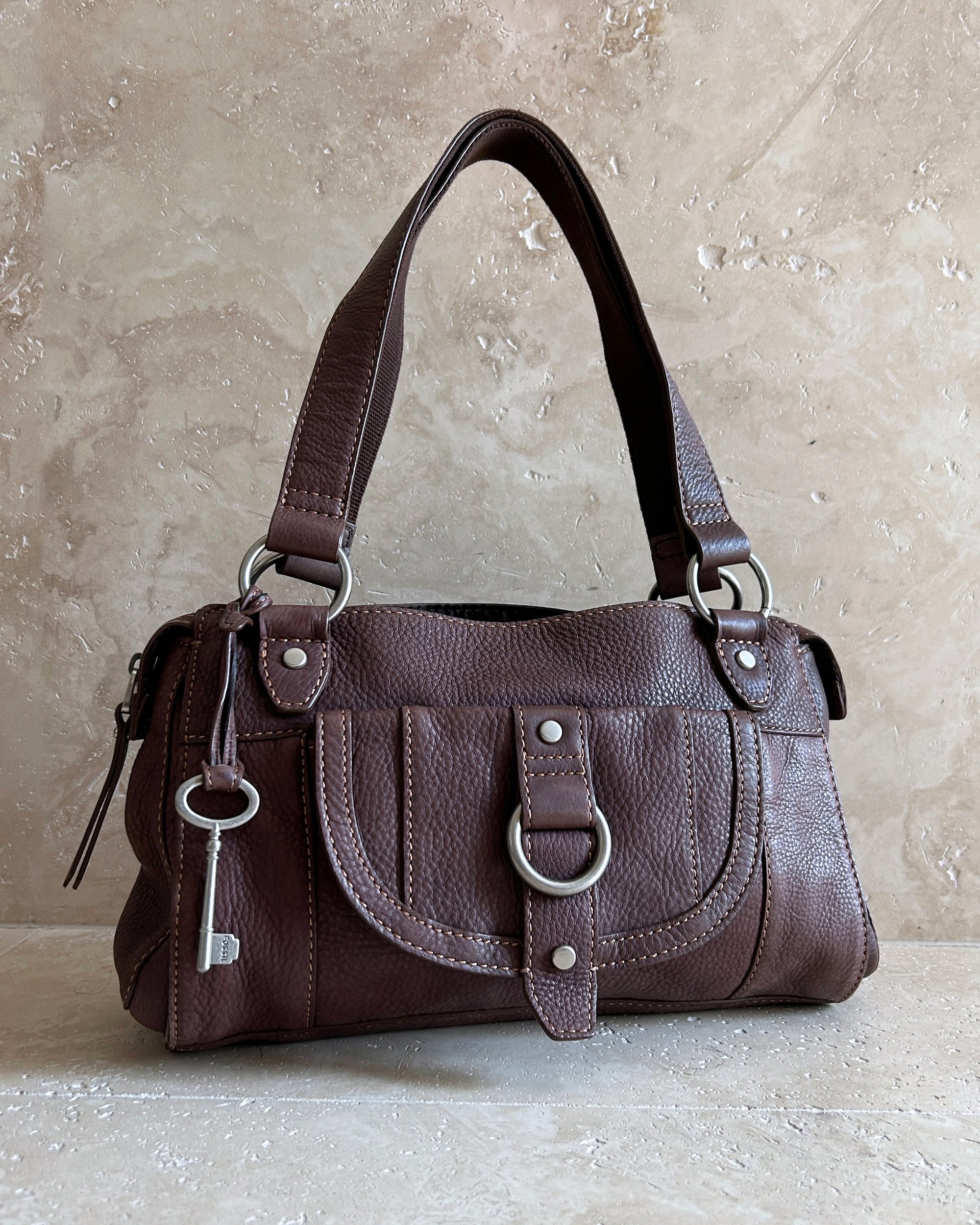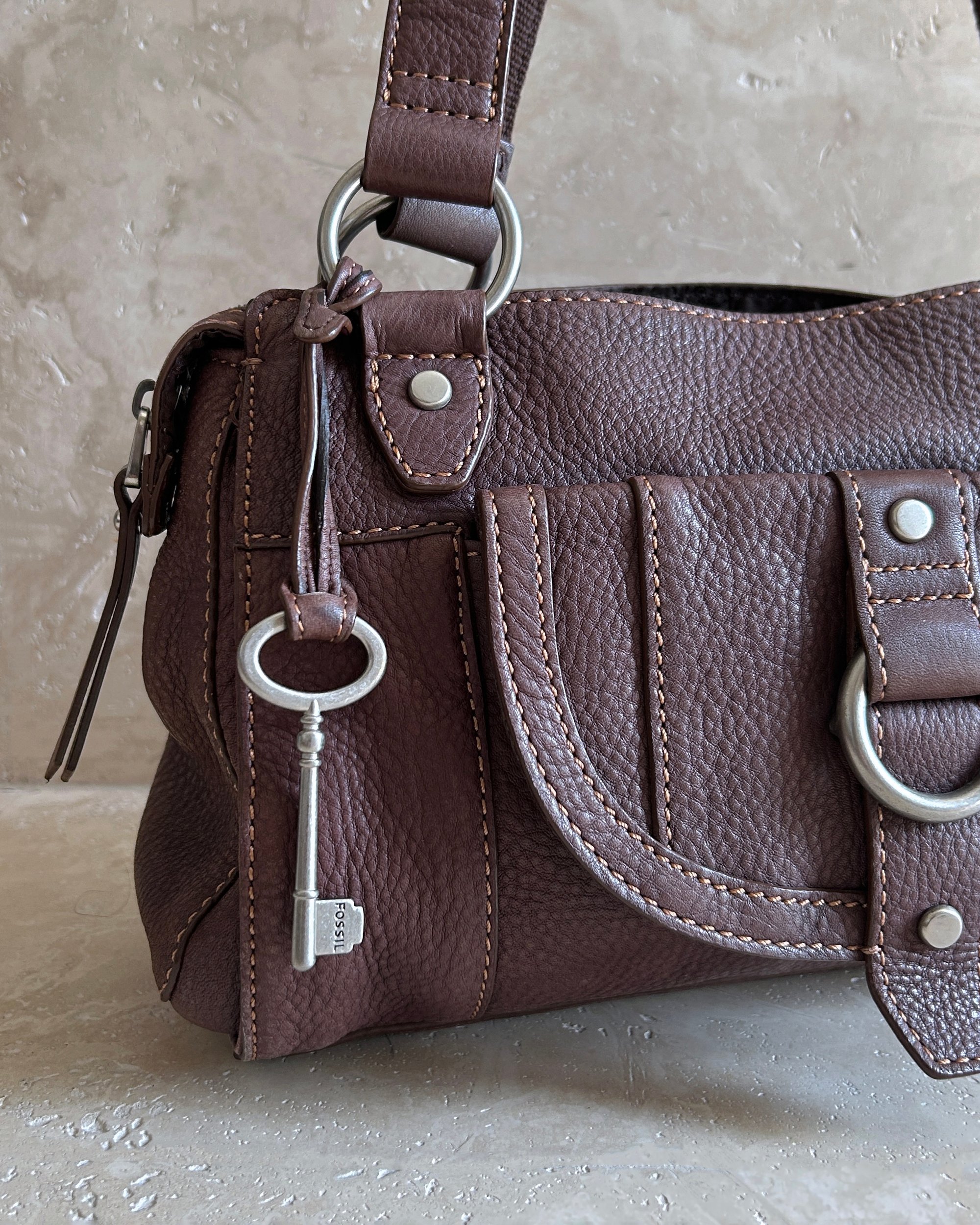 CHOCOLATE BROWN | Vintage Fossil genuine leather shoulder bag with silver hardware and key charm.