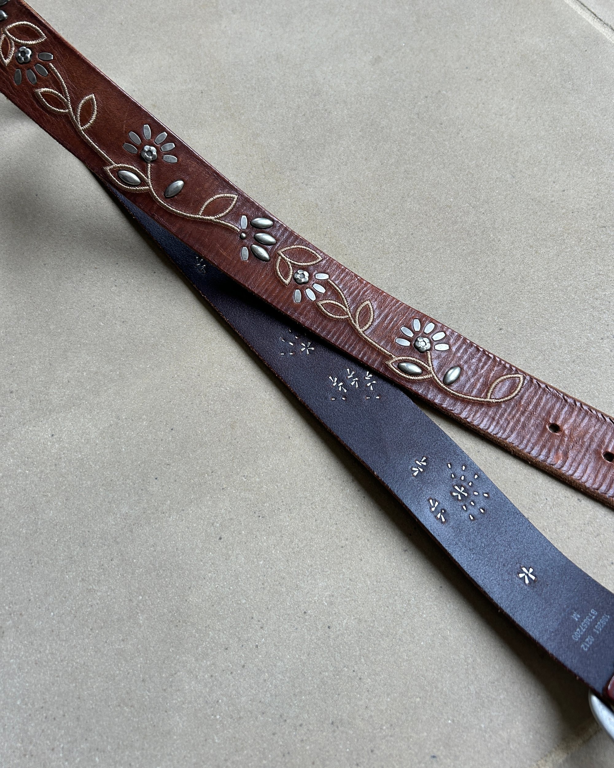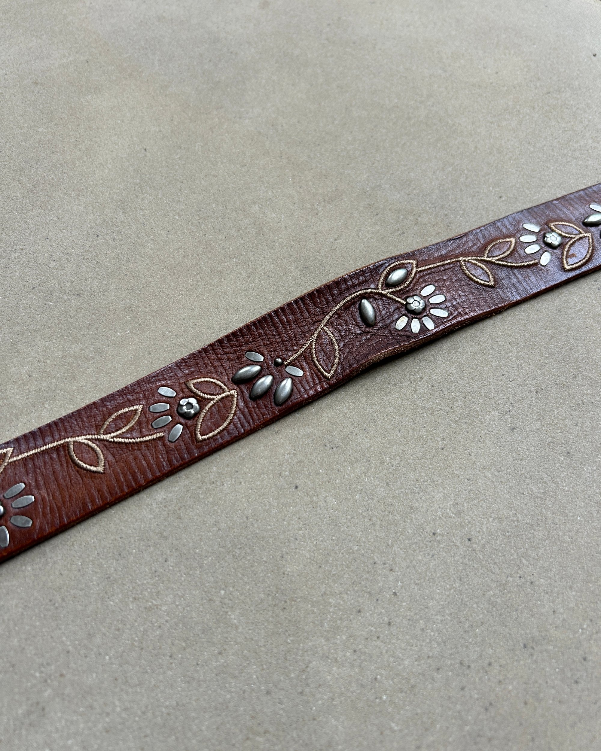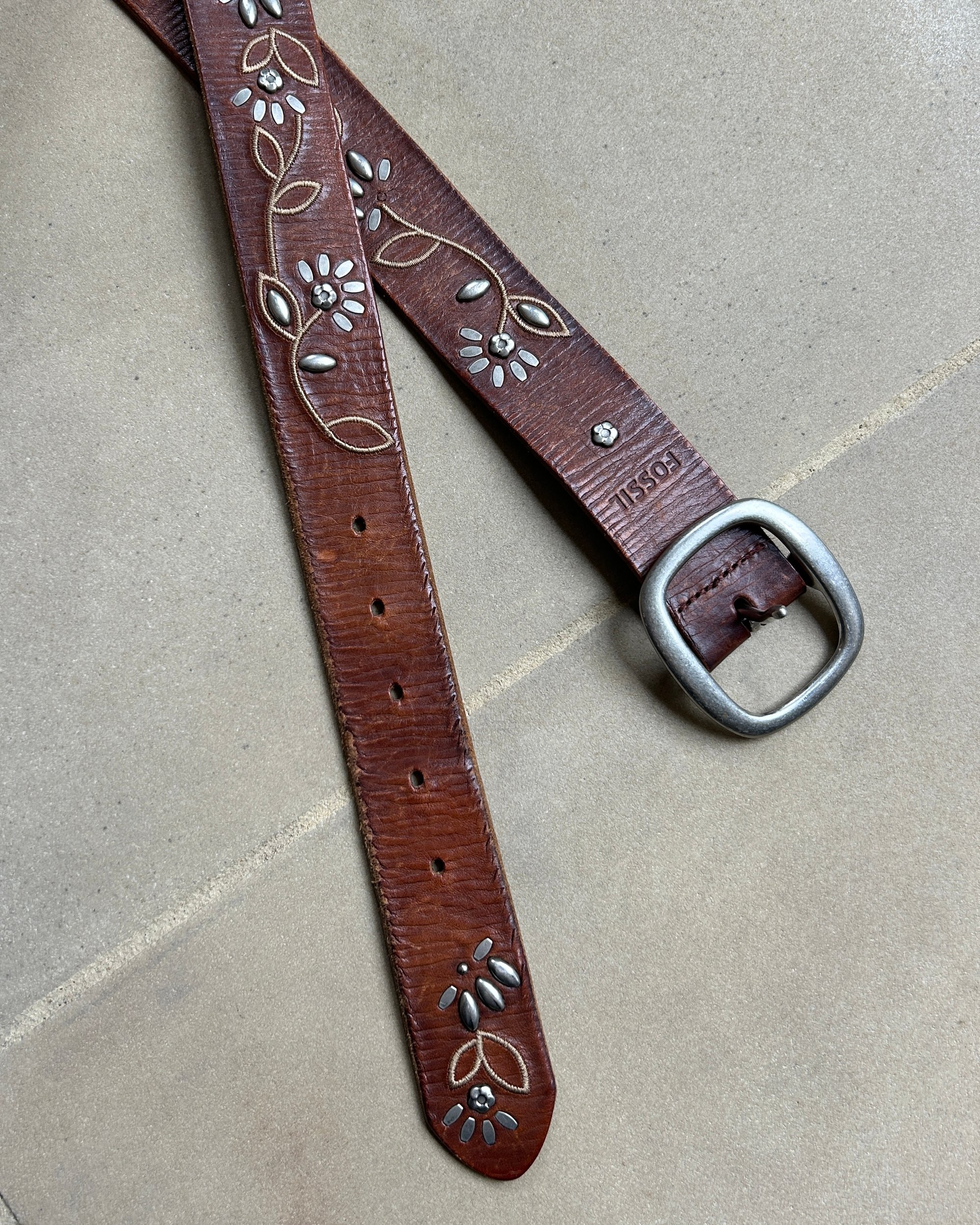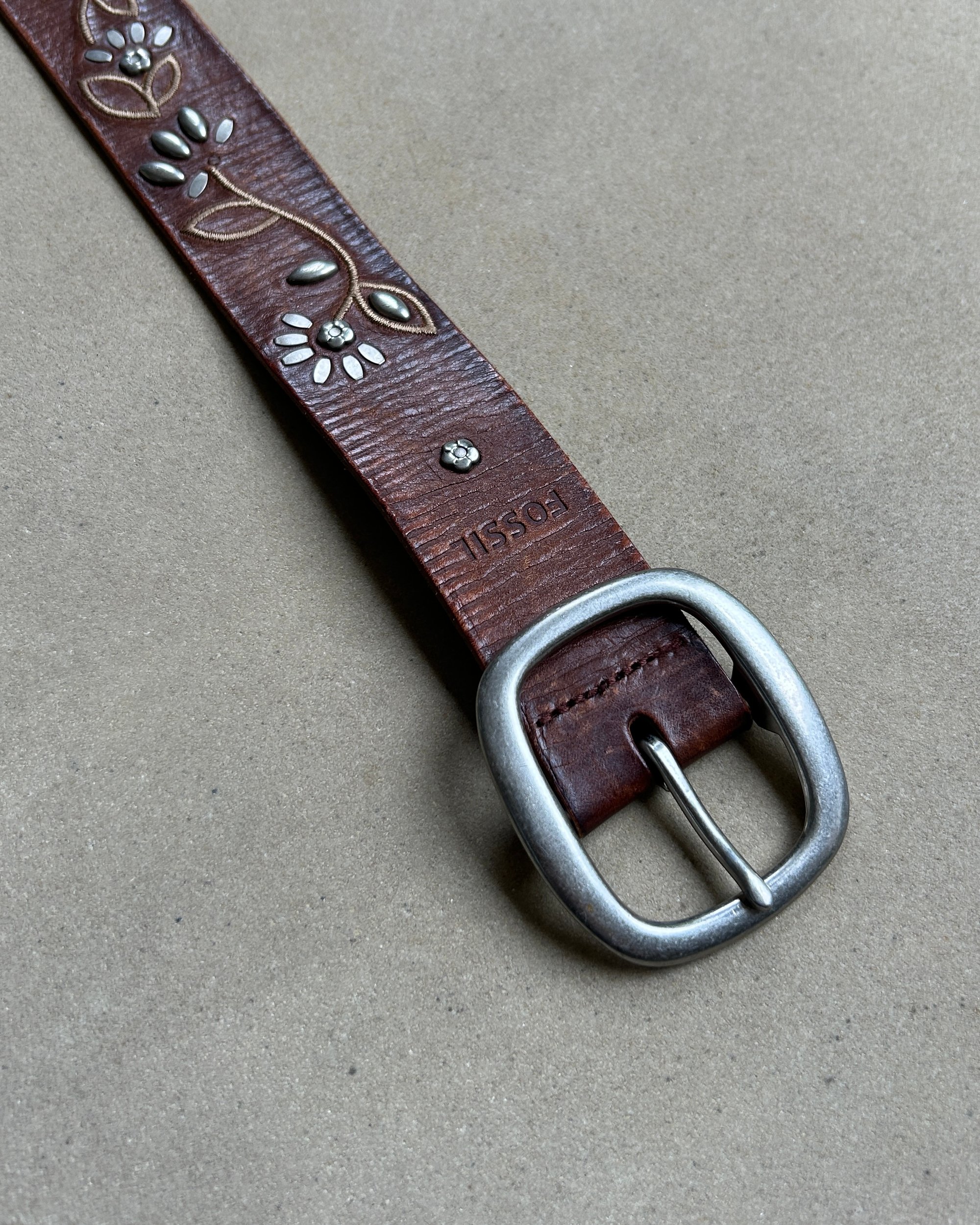 SIZE M | Vintage genuine leather Fossil brown belt with floral motif and silver hardware.