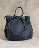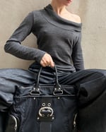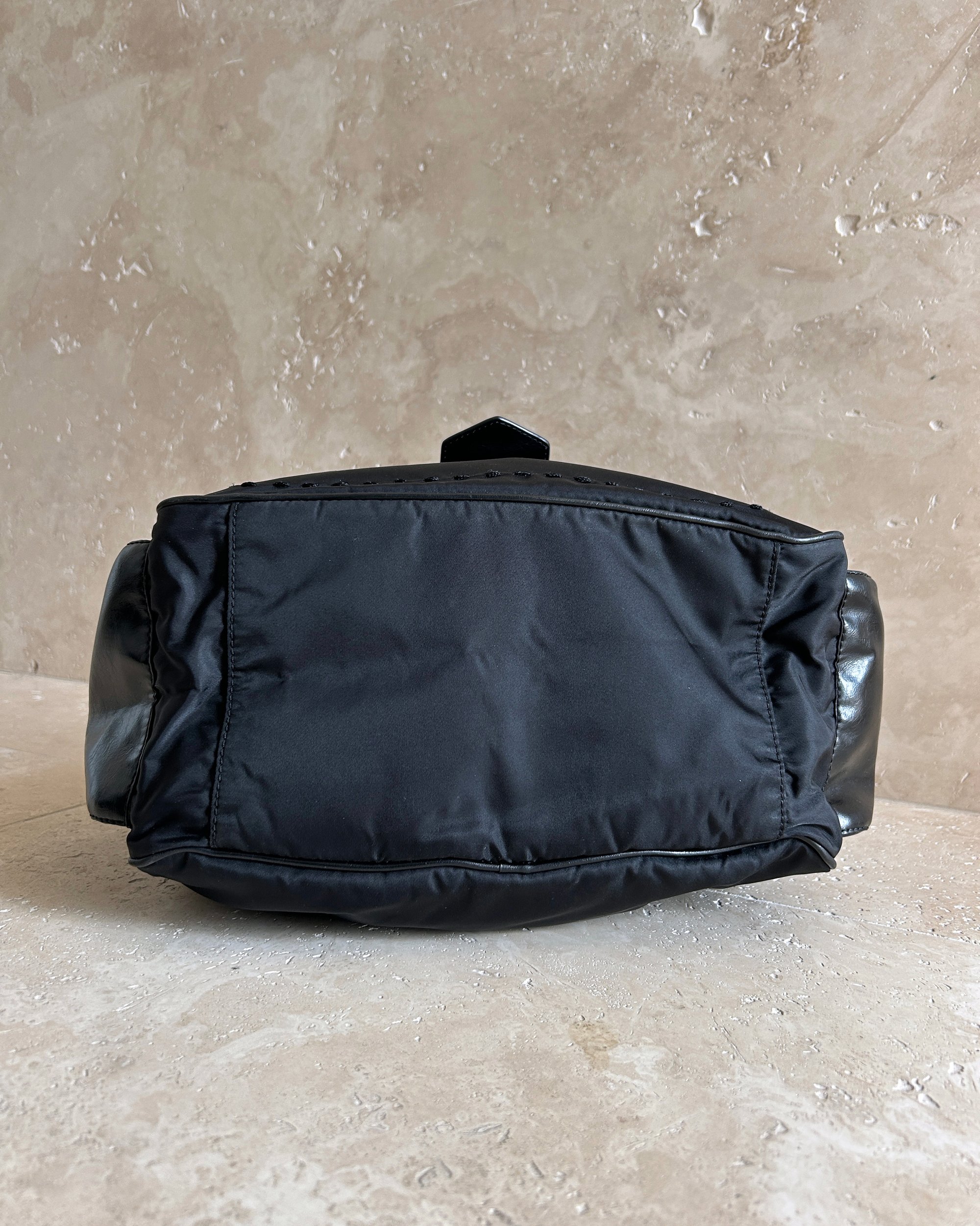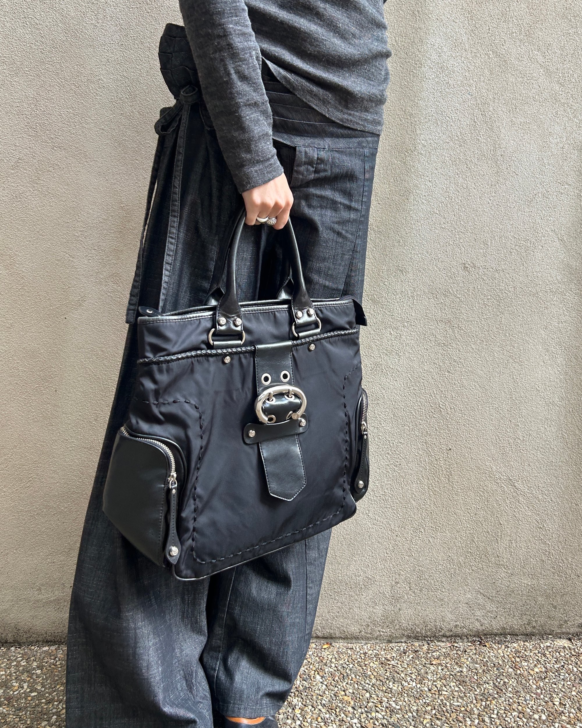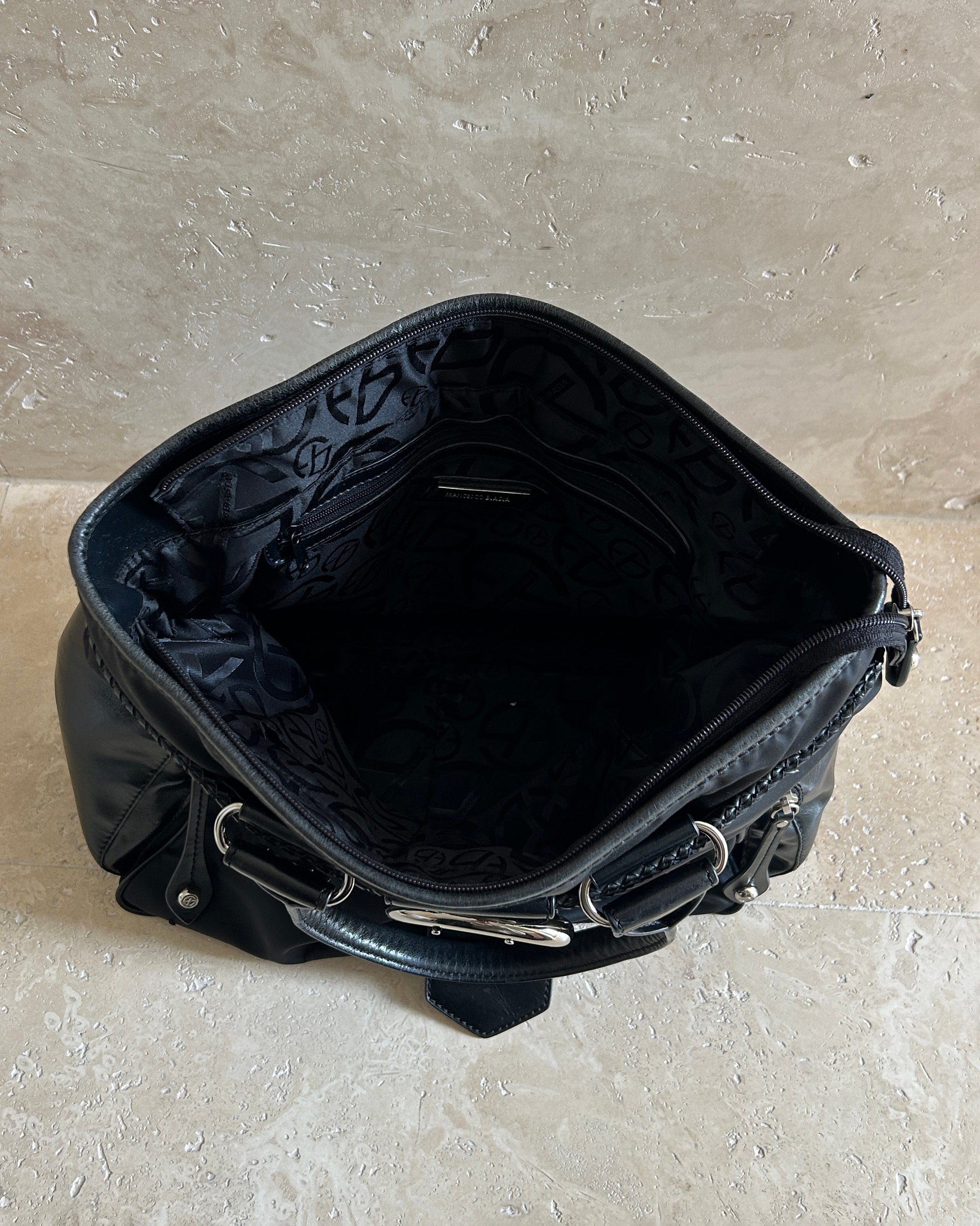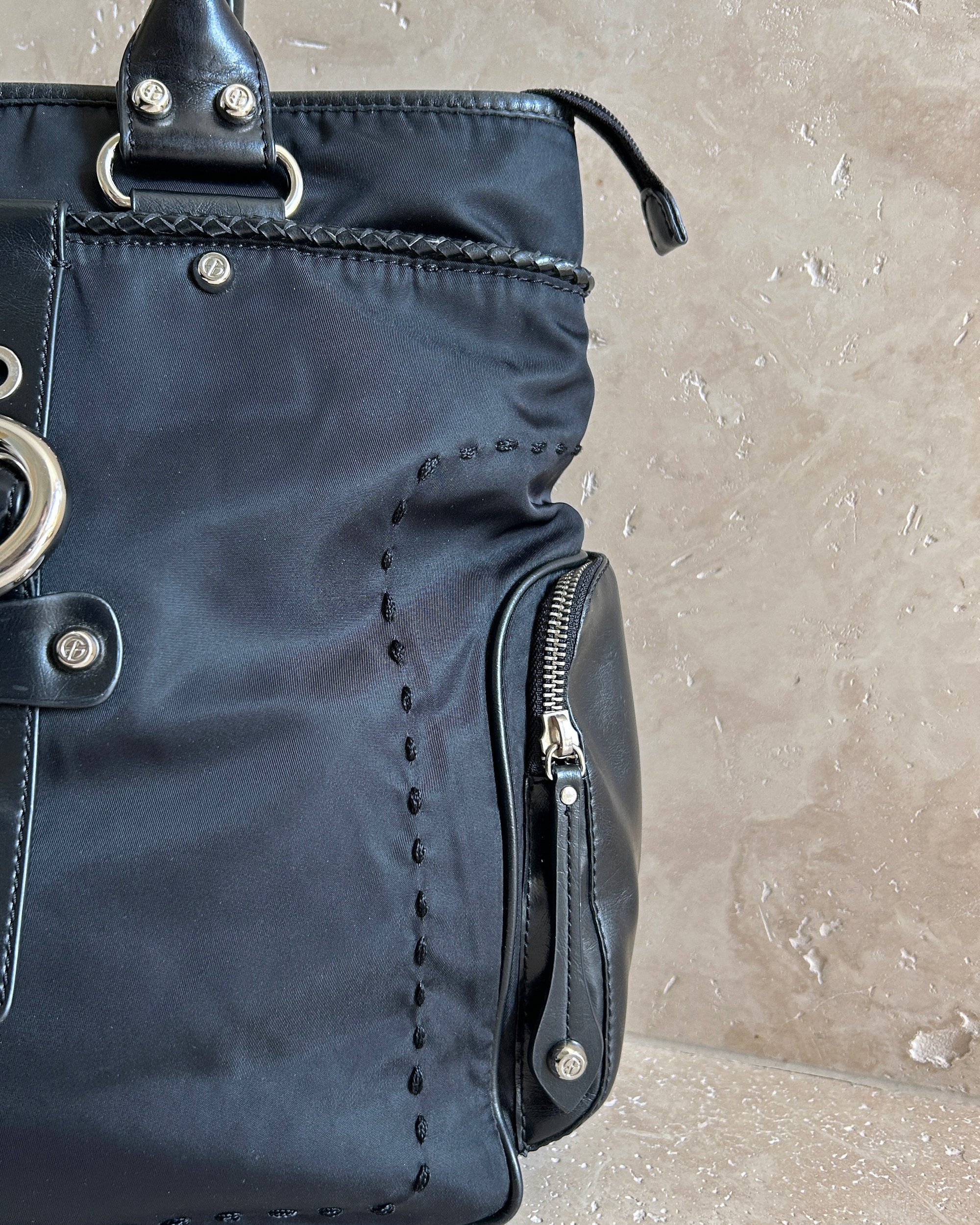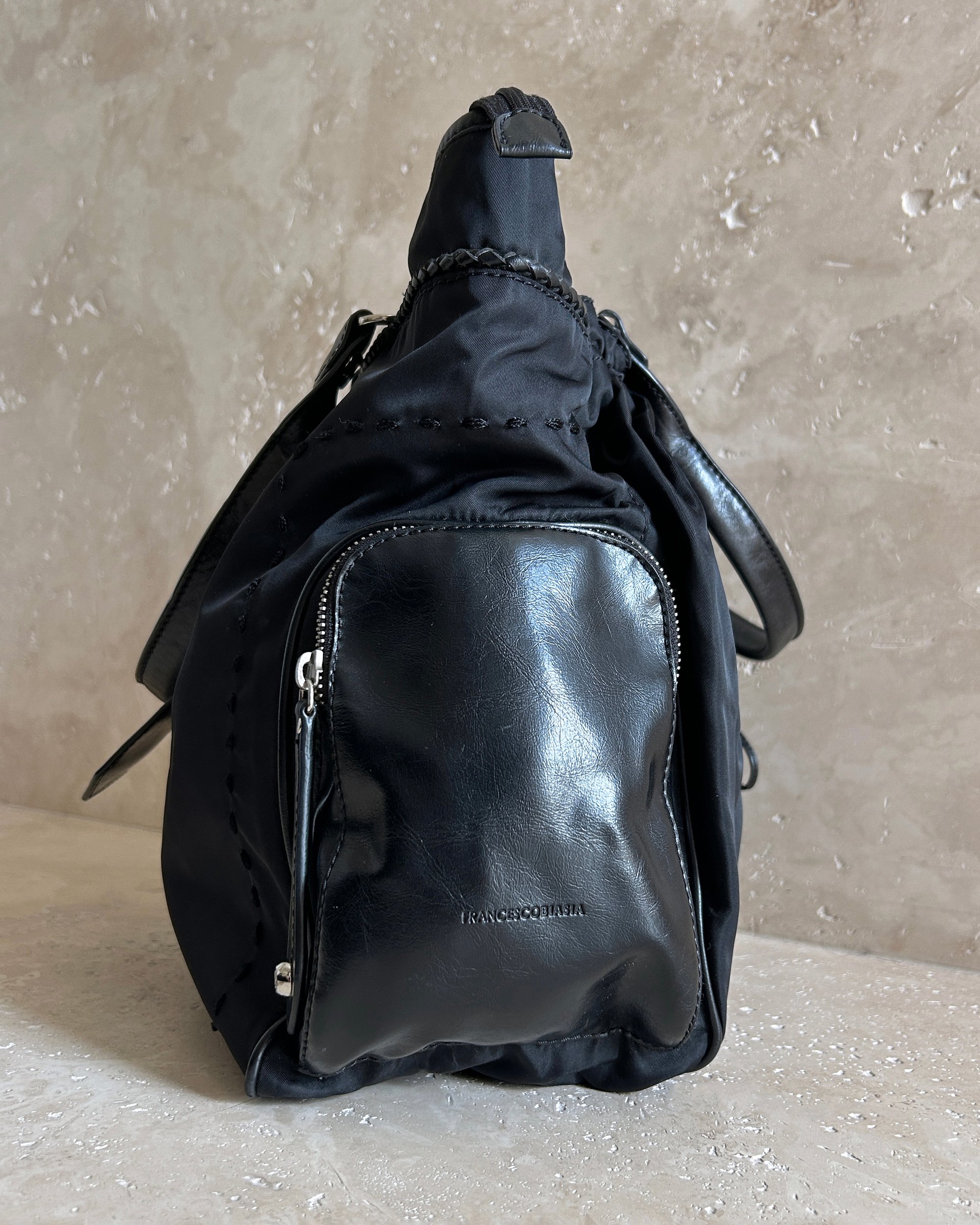 BLACK | Italian designer Francesco Biasia nylon and genuine leather bag with silver hardware.