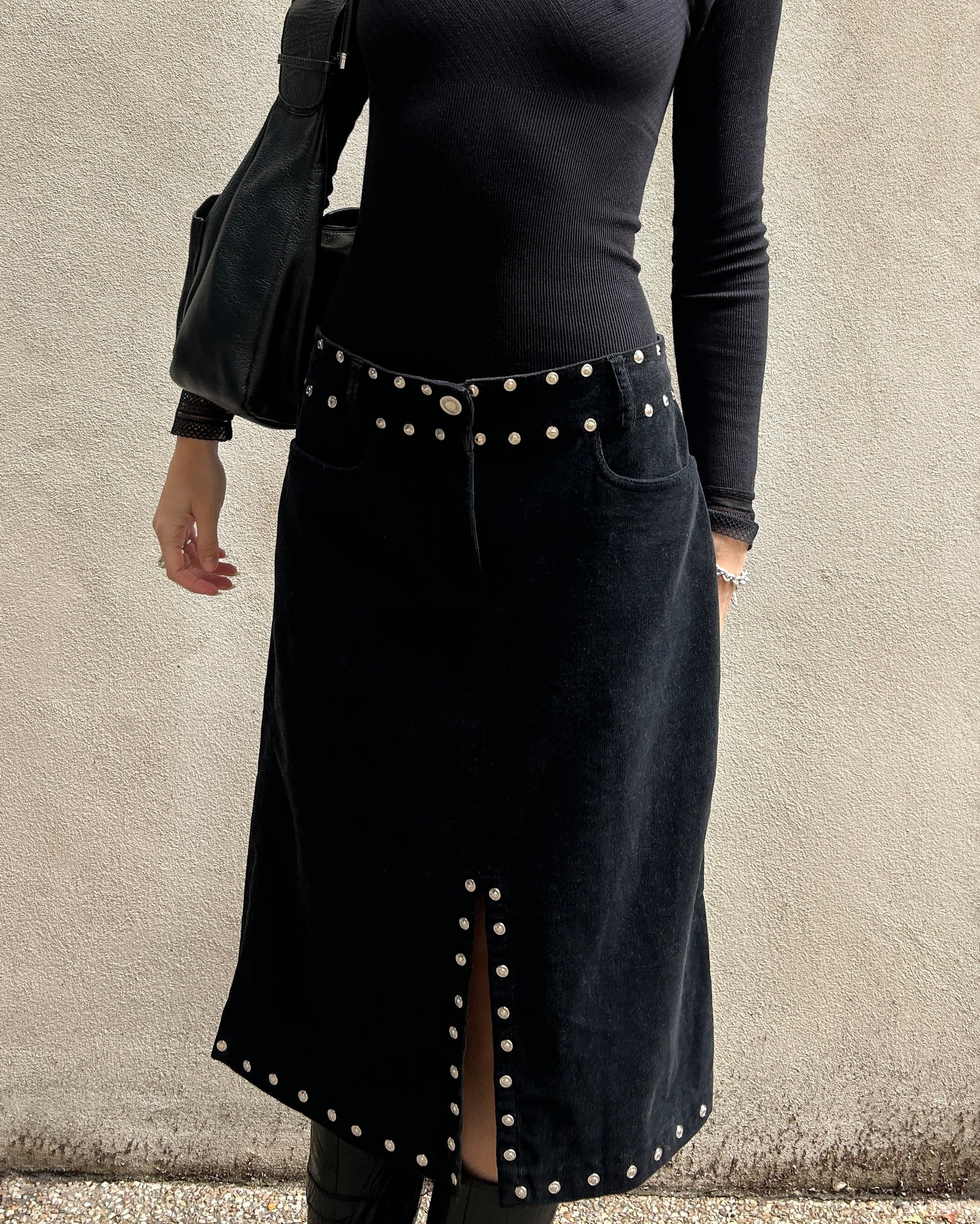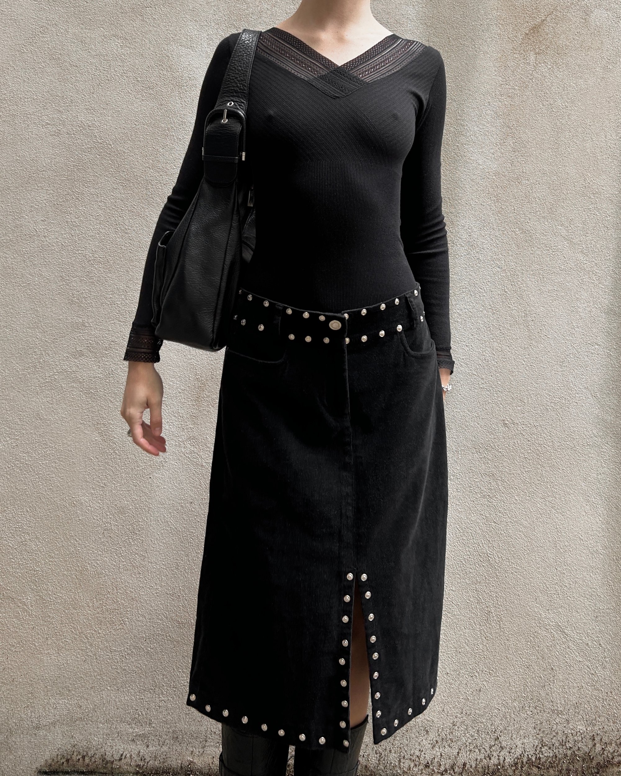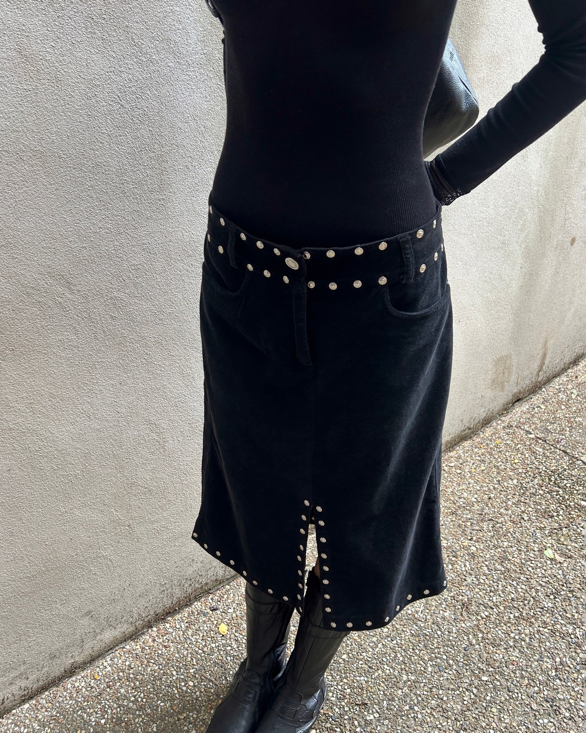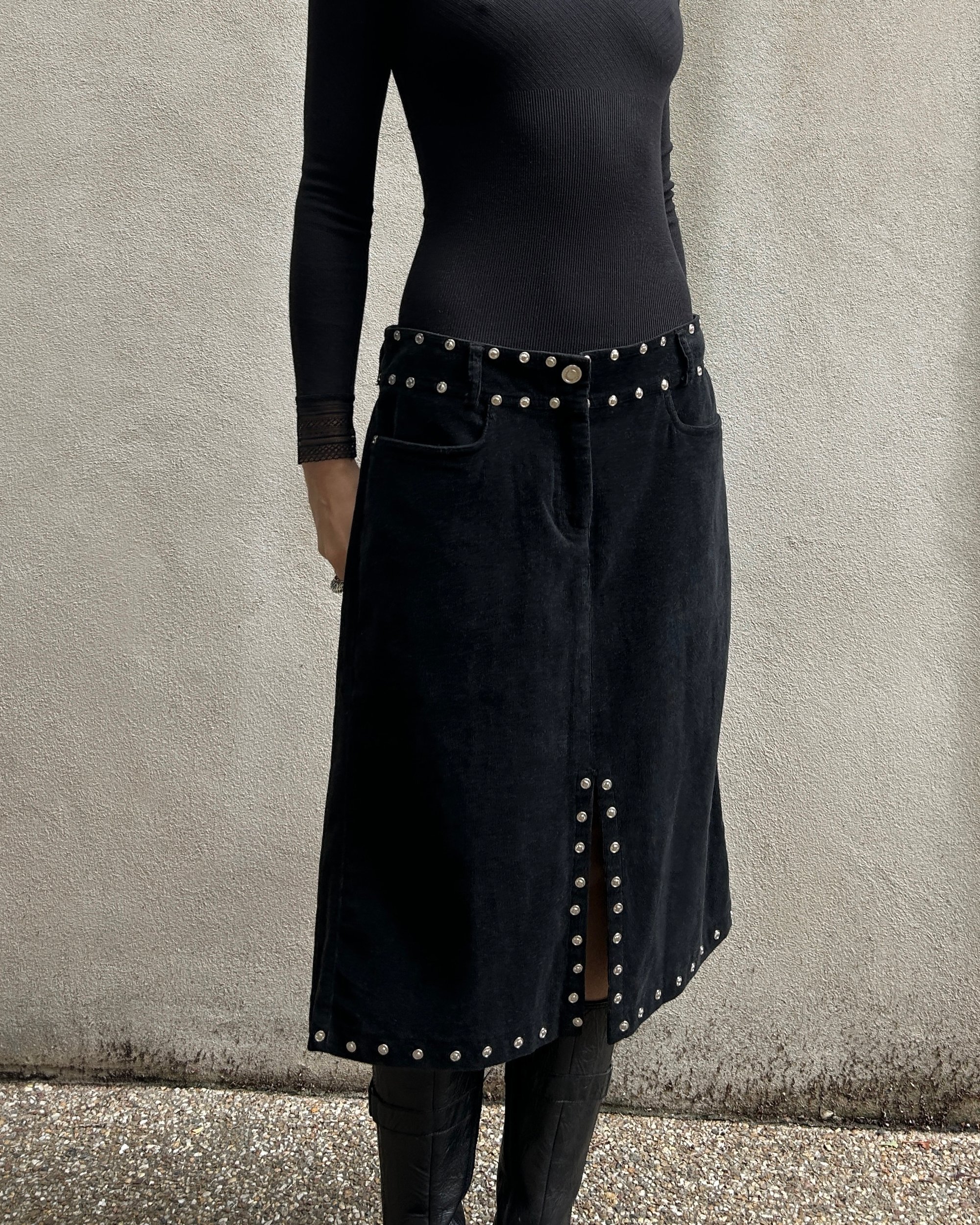 SIZE S/M | Vintage Italian designer Montana Blu baby-corduroy studded skirt in black.