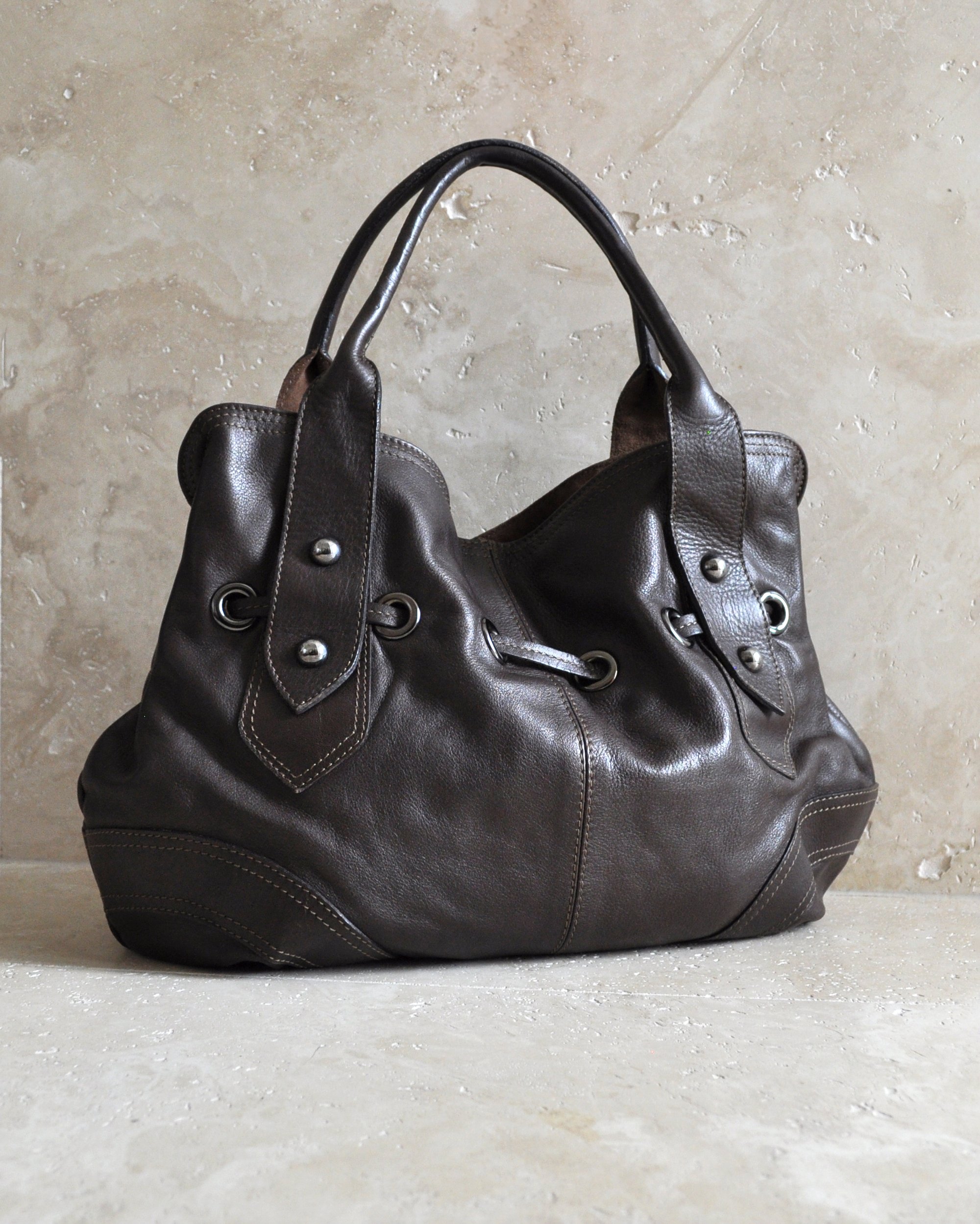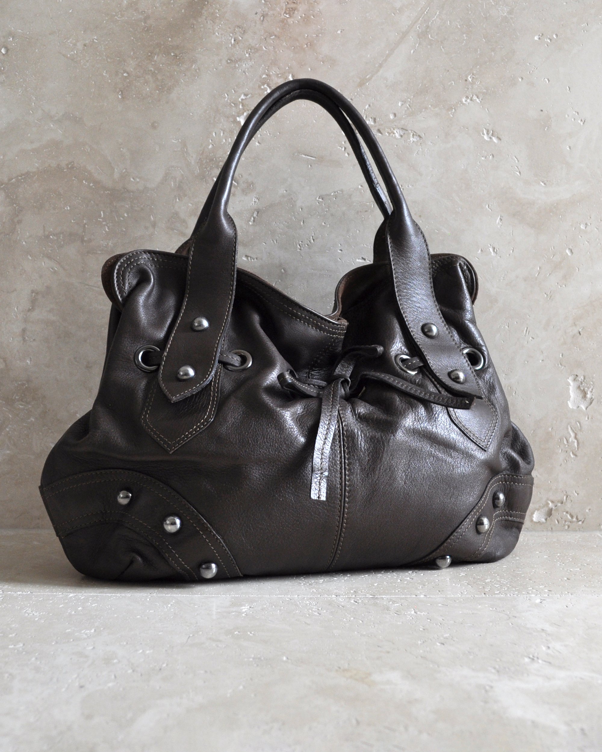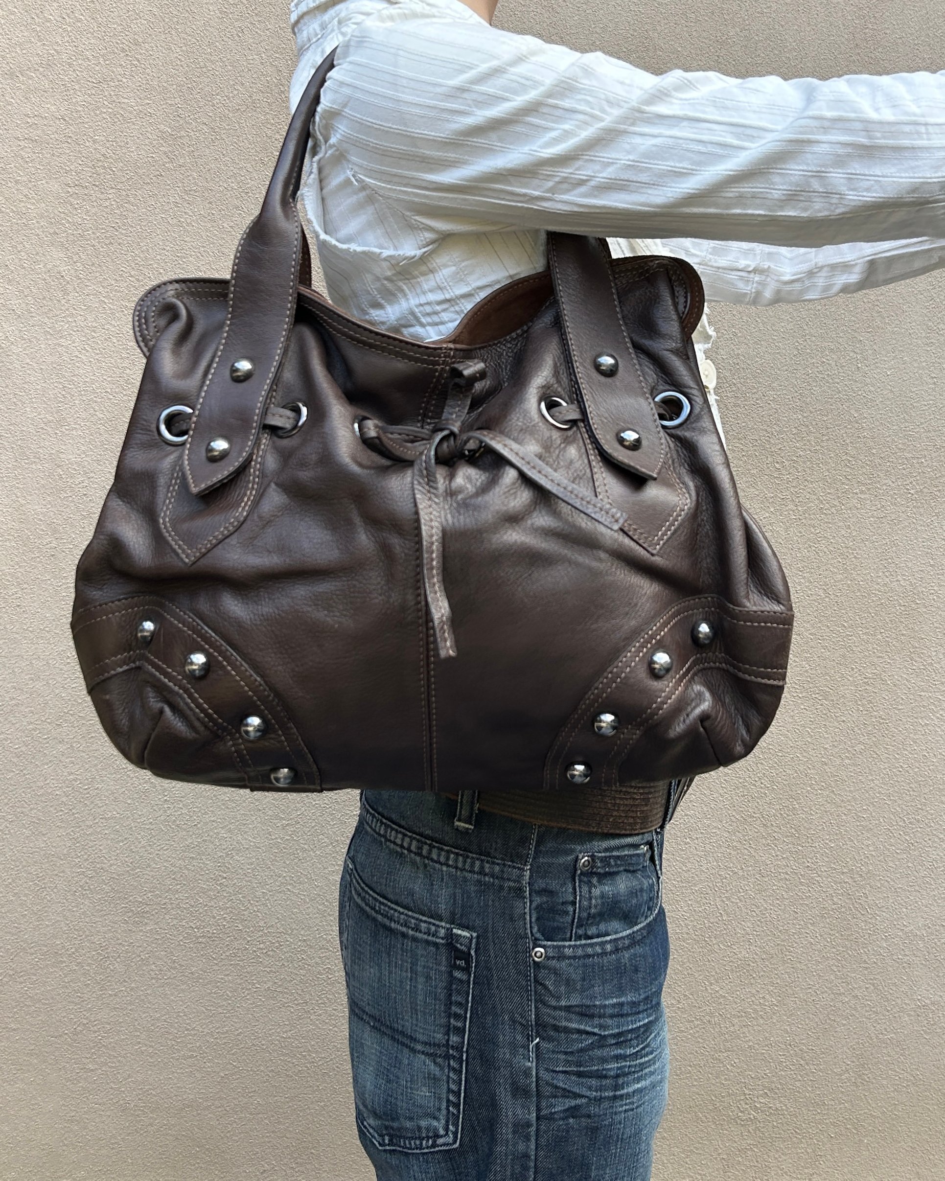 BROWN | Vintage large genuine leather shoulder bag with stud and drawstring detail.