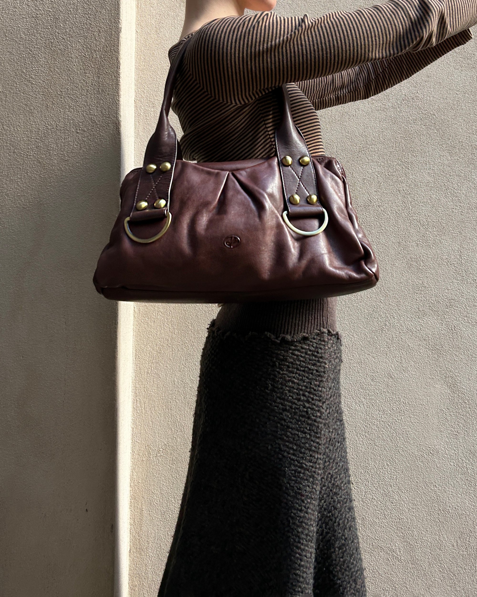 BROWN WITH BURGUNDY UNDERTONE | Vintage genuine leather shoulder bag with gold d-ring hardware.
