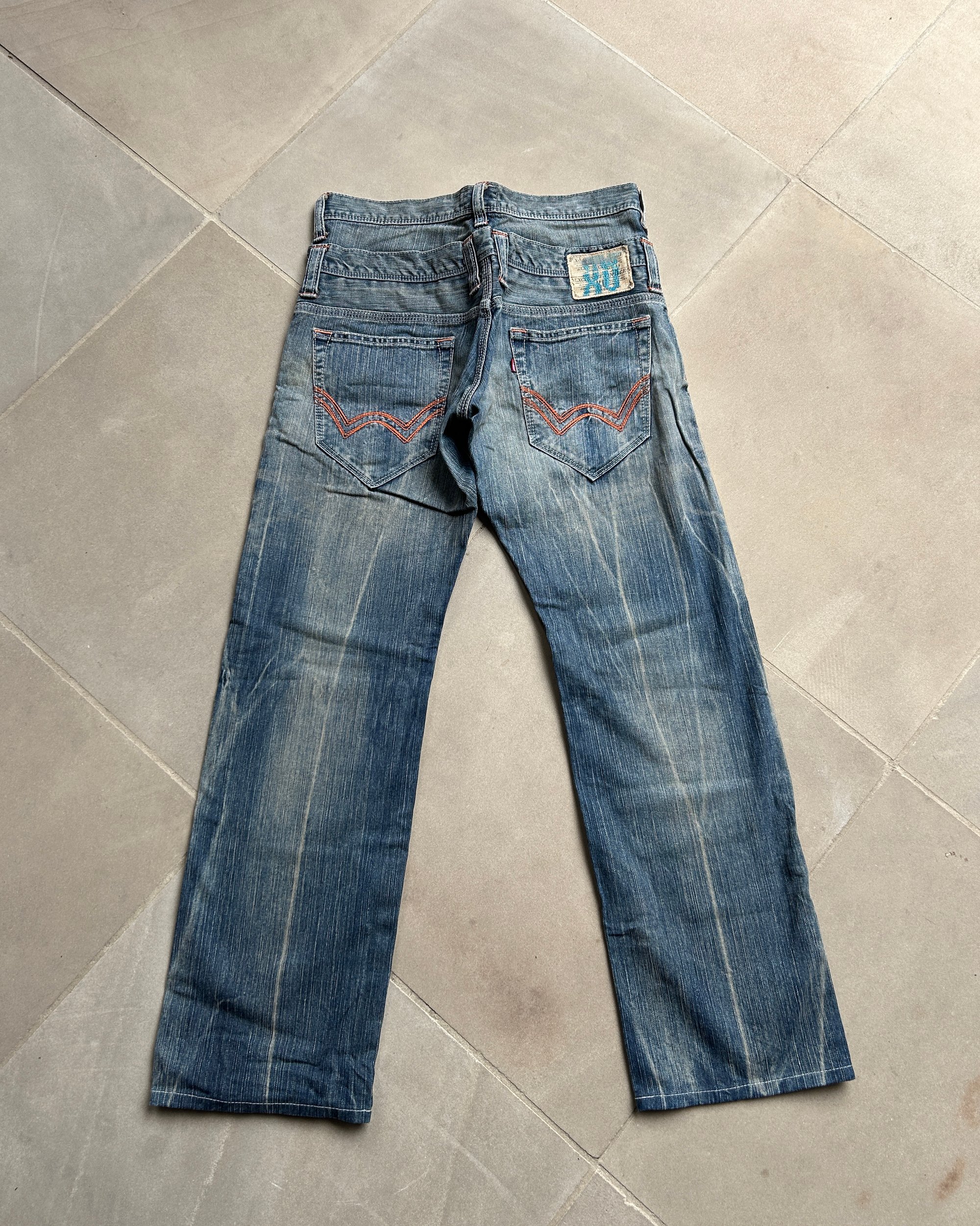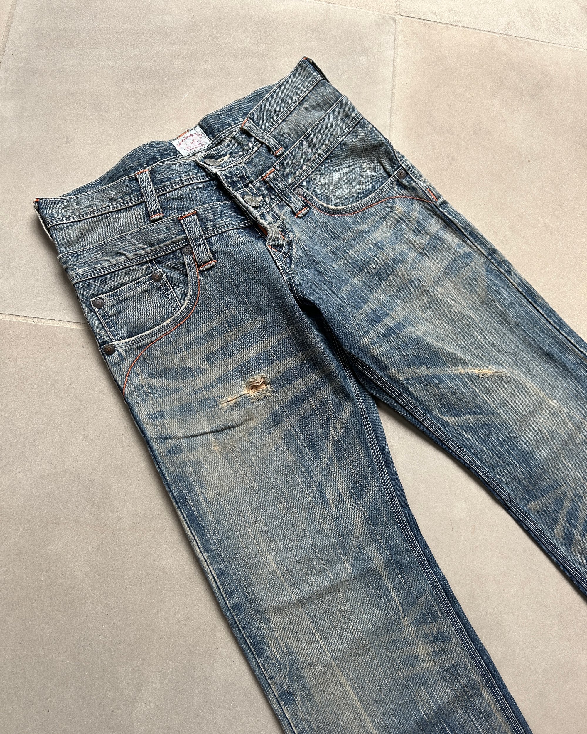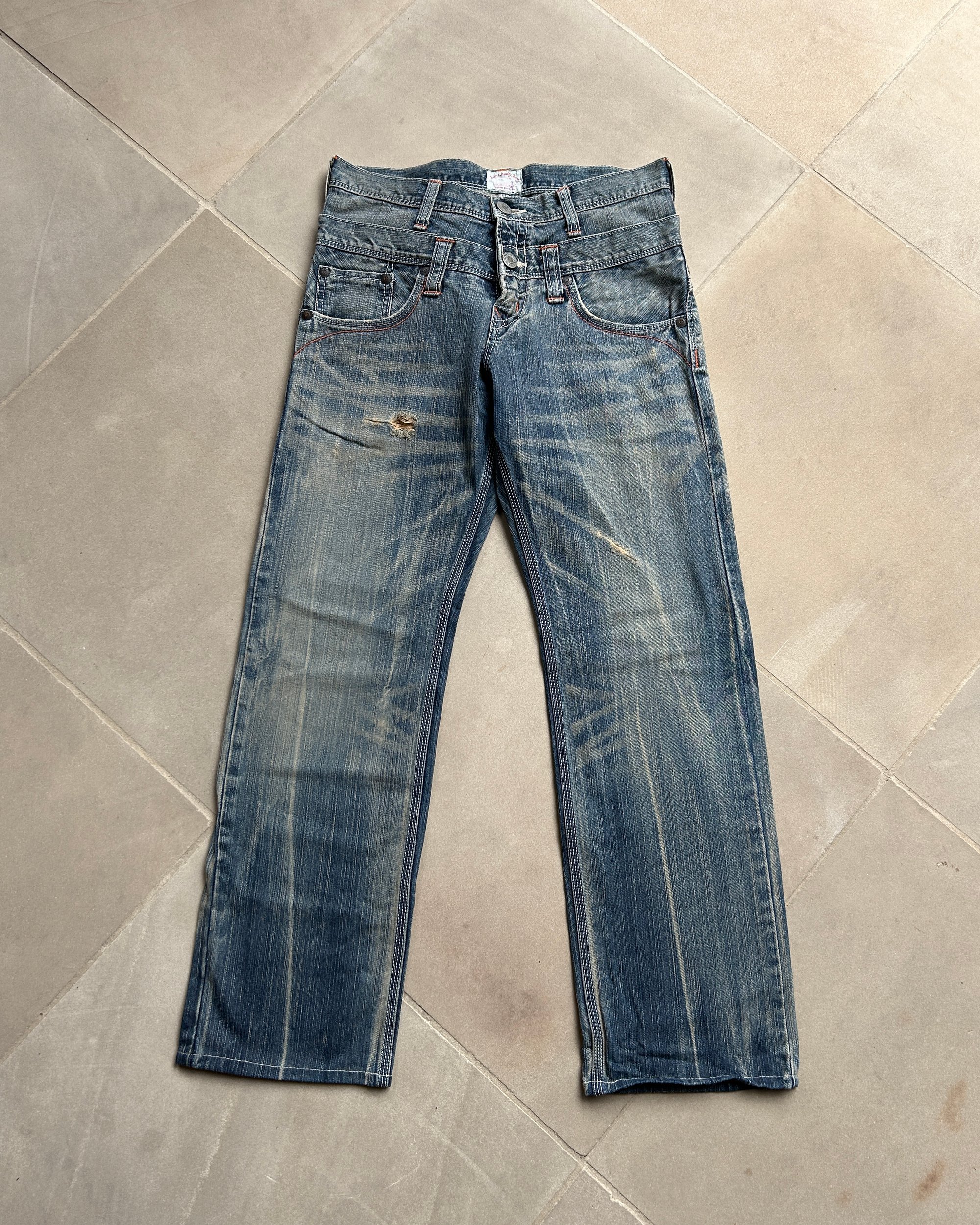 SIZE W 30" | Vintage Japanese label unisex double waistband distressed jeans.