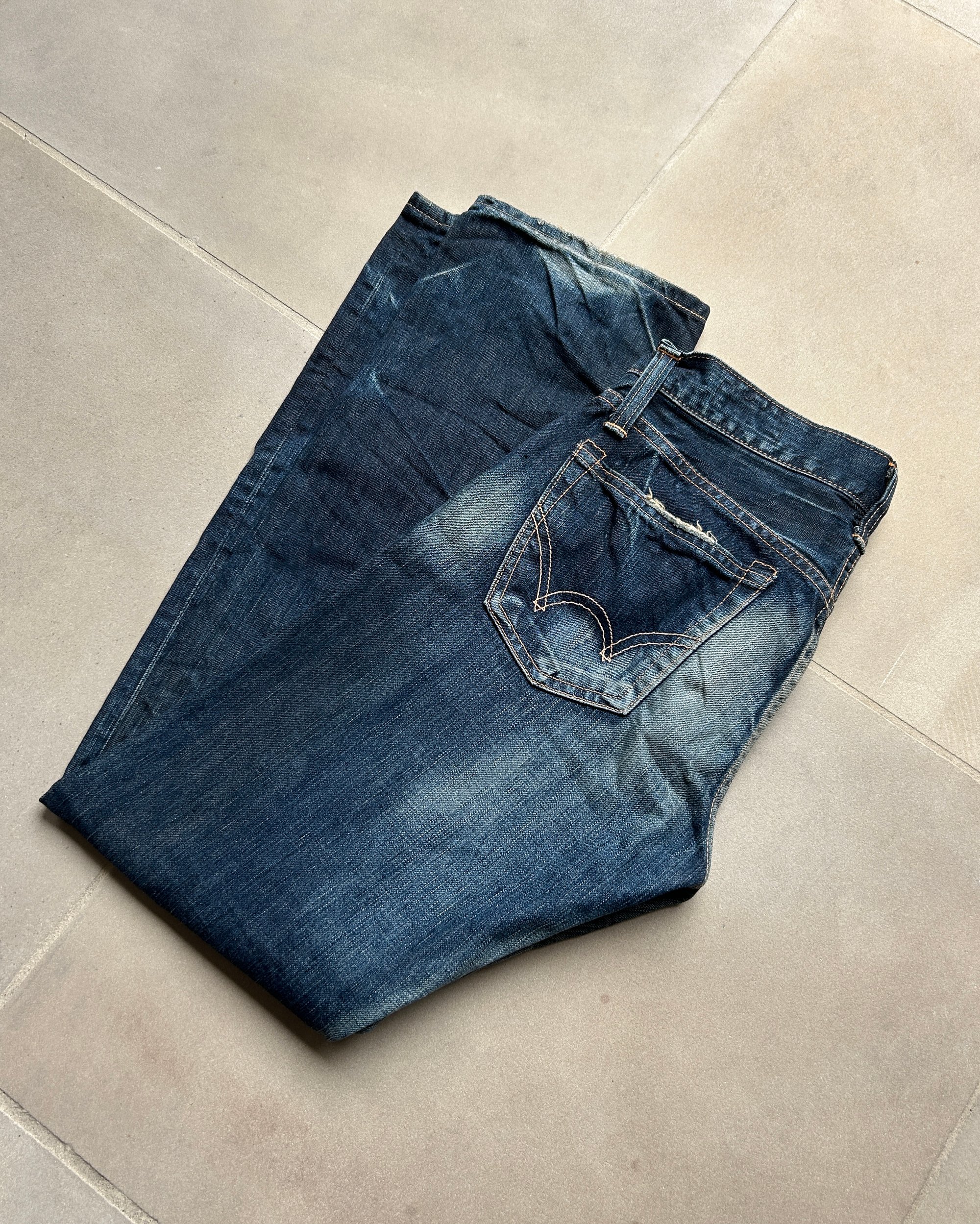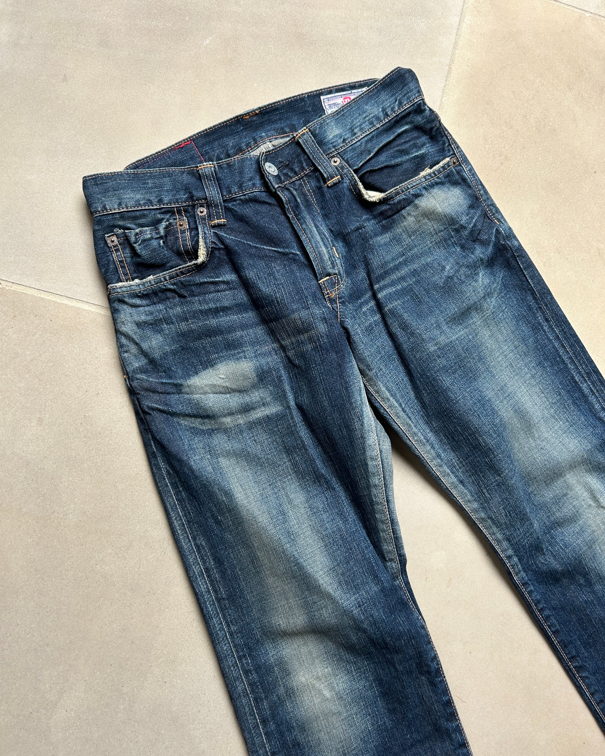 SIZE W 28" | Vintage Japanese label distressed unisex dark wash jeans.