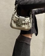Stirrup fob detail with magnetic strap closure. Three inner pocket compartments, one with a zip closure. Adjustable buckle detail on handle. Beige lining. Thick textured leather with a distressed metallic finish.