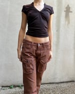 Lowrise cropped fit with a slight flared leg. Puffy cargo pockets front and back.