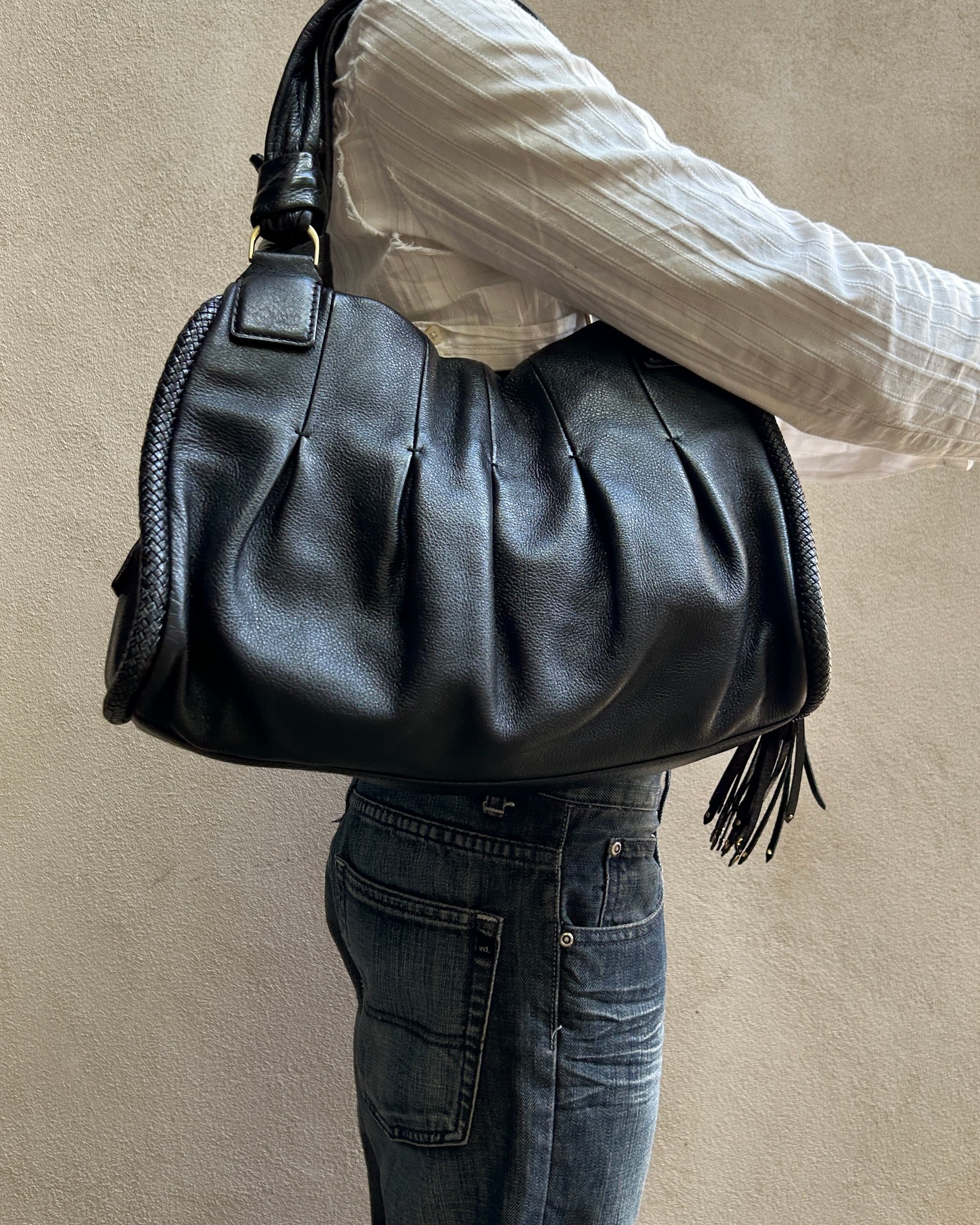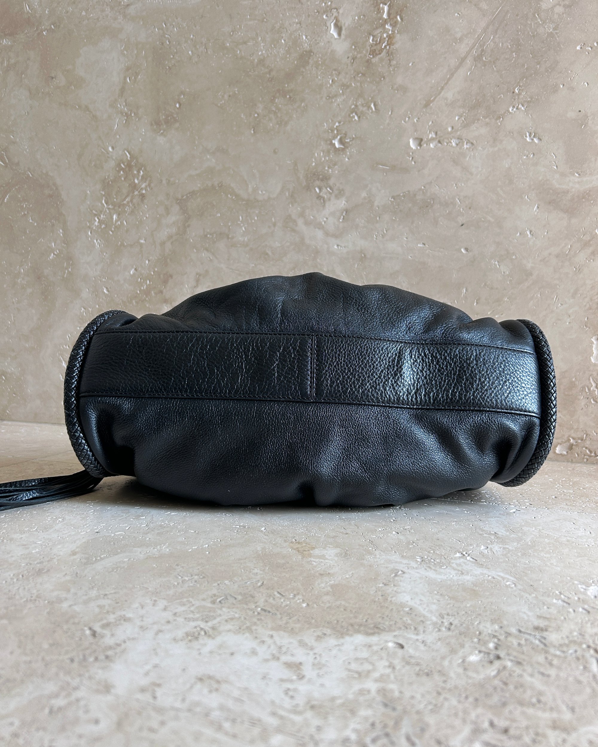 BLACK | Vintage Cole Haan genuine leather shoulder bag with brushed gold hardware.