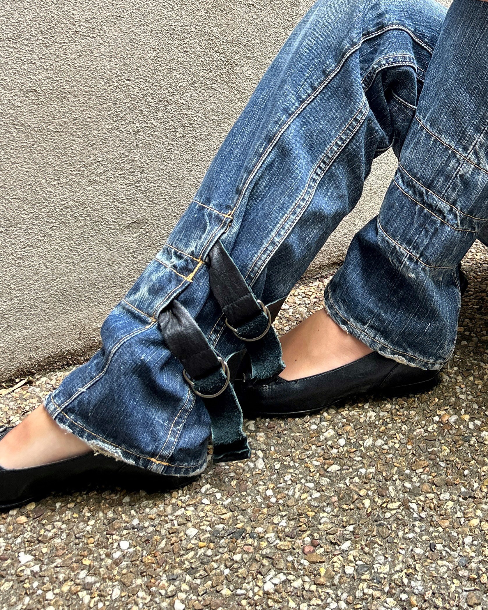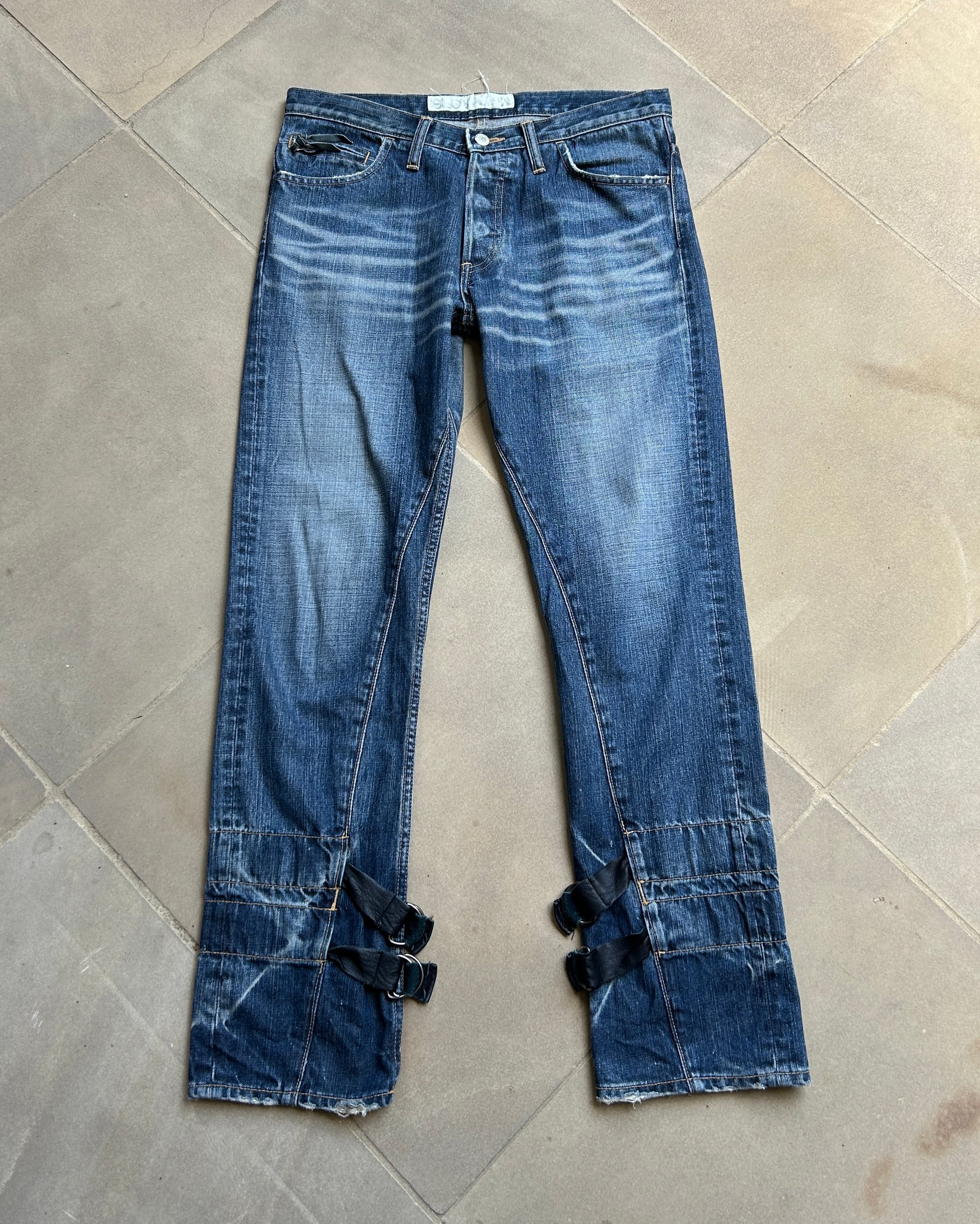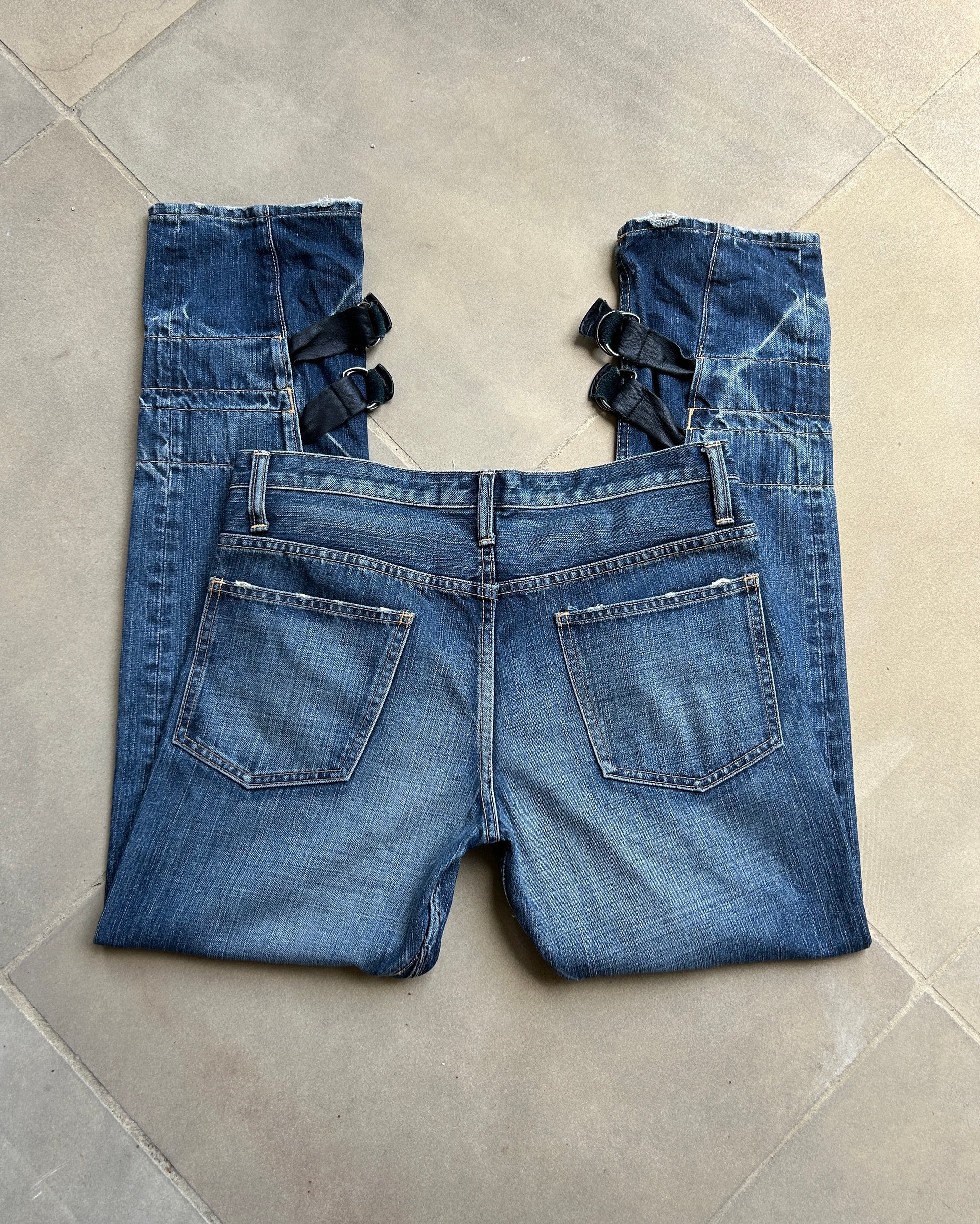 SIZE 32" | Vintage Japanese brand straight leg jeans with leather straps.