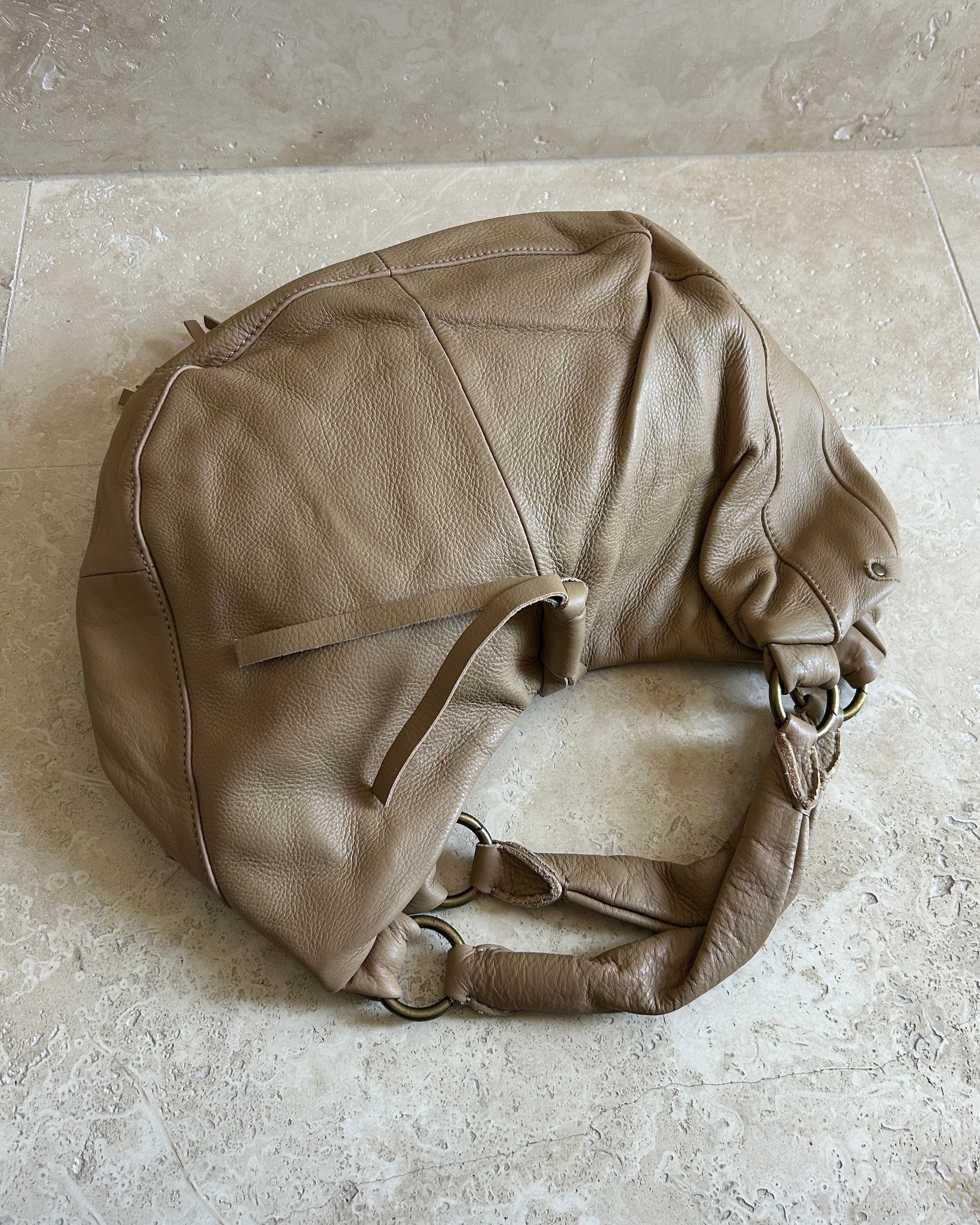 Slouchy genuine leather. Three inner pocket compartments, one with a zip closure. The large tassels fold over the opening of the bag, acting as a form of closure.