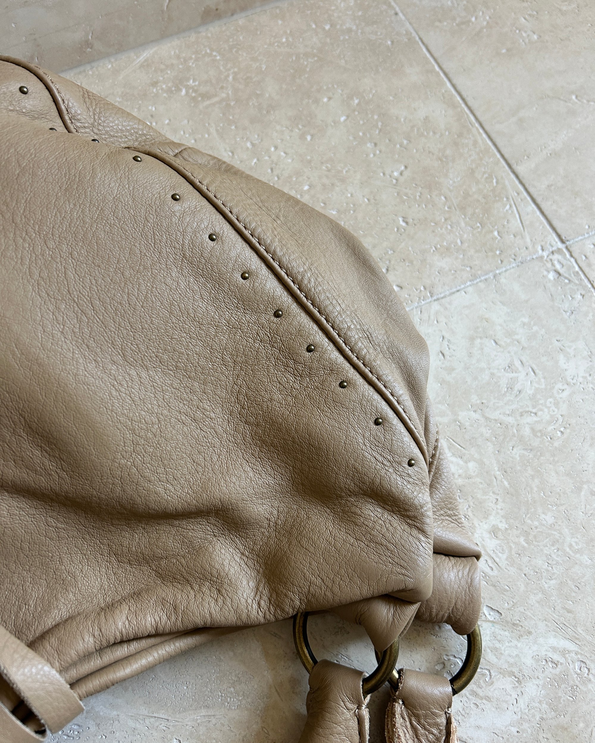 BEIGE | Japanese genuine leather bag with large tassels and small gold studs.