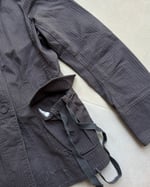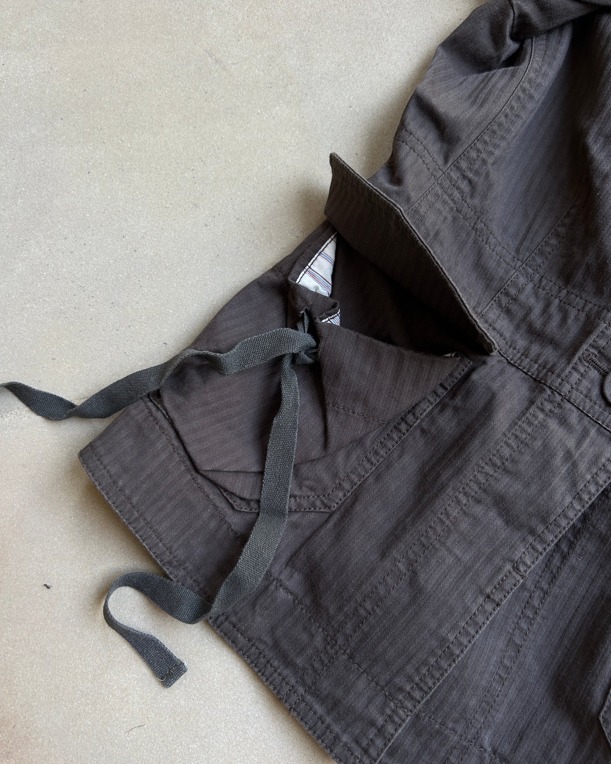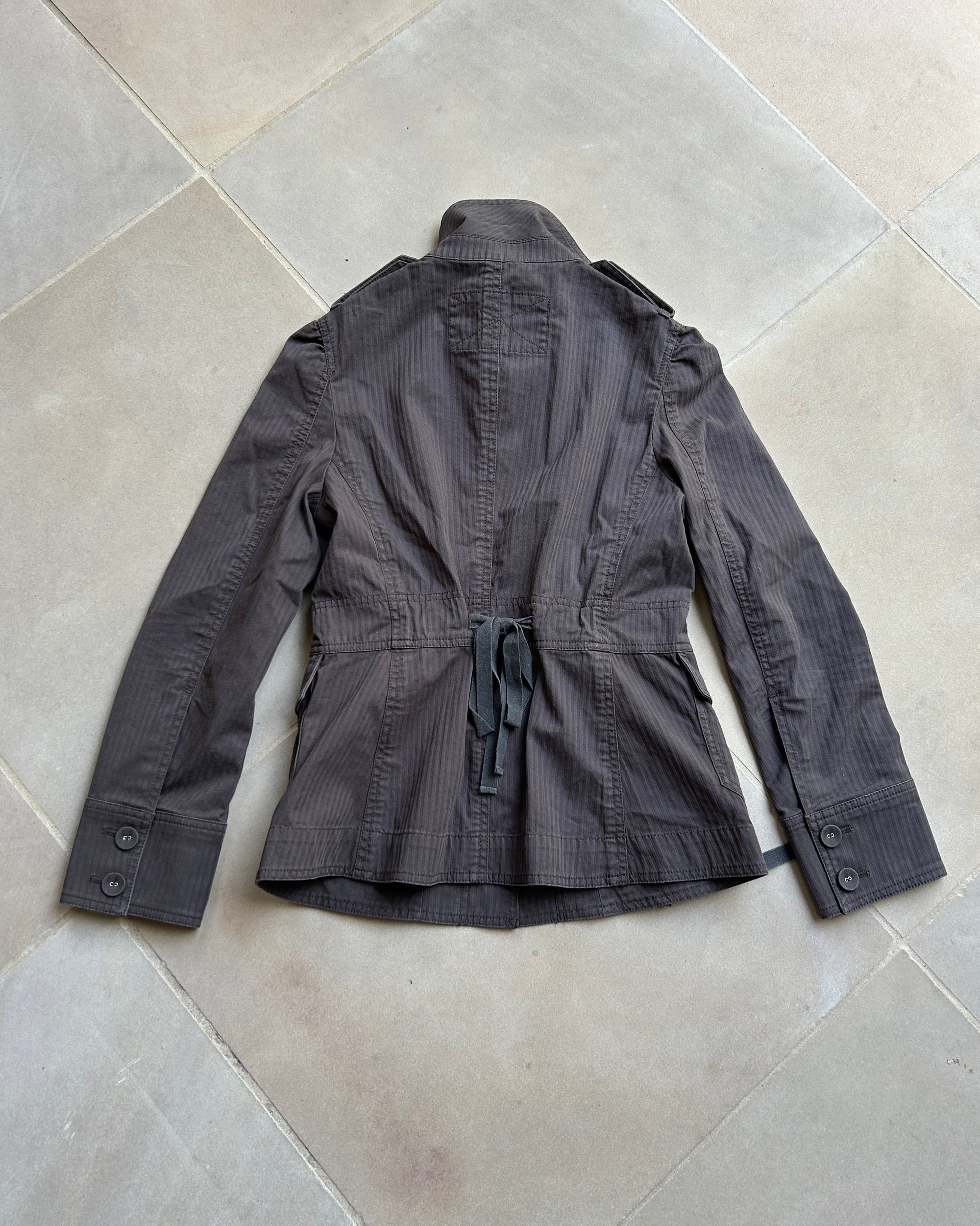 No fabric label, feels like cotton. Two front functional pockets with long drawstring ties. Adjustable tie at the back of the jacket, allowing you to cinch in the waist for a flattering silhouette.