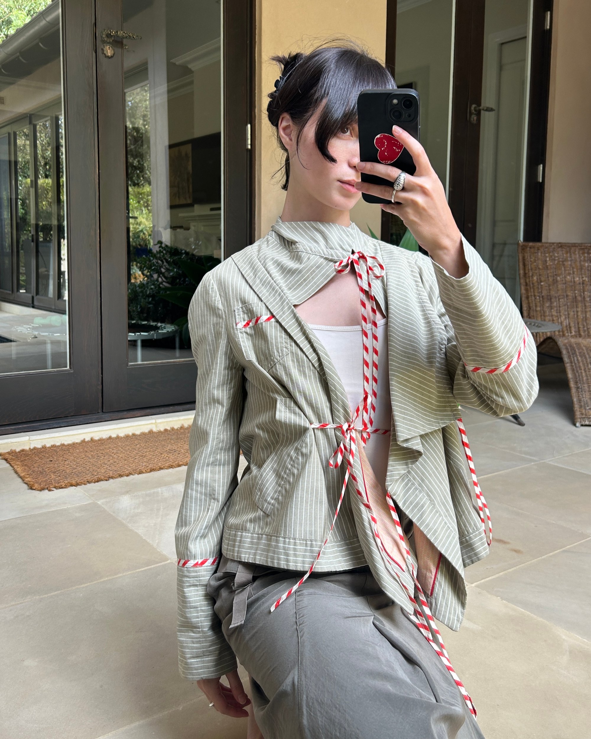 96% cotton, 2% lurex. The white stripes have a subtle silver metallic thread woven throughout. Jacket can be tied up in multiple ways by utilising the string ties. Three pockets. Cute heart print lining. Pictured on a size 6.