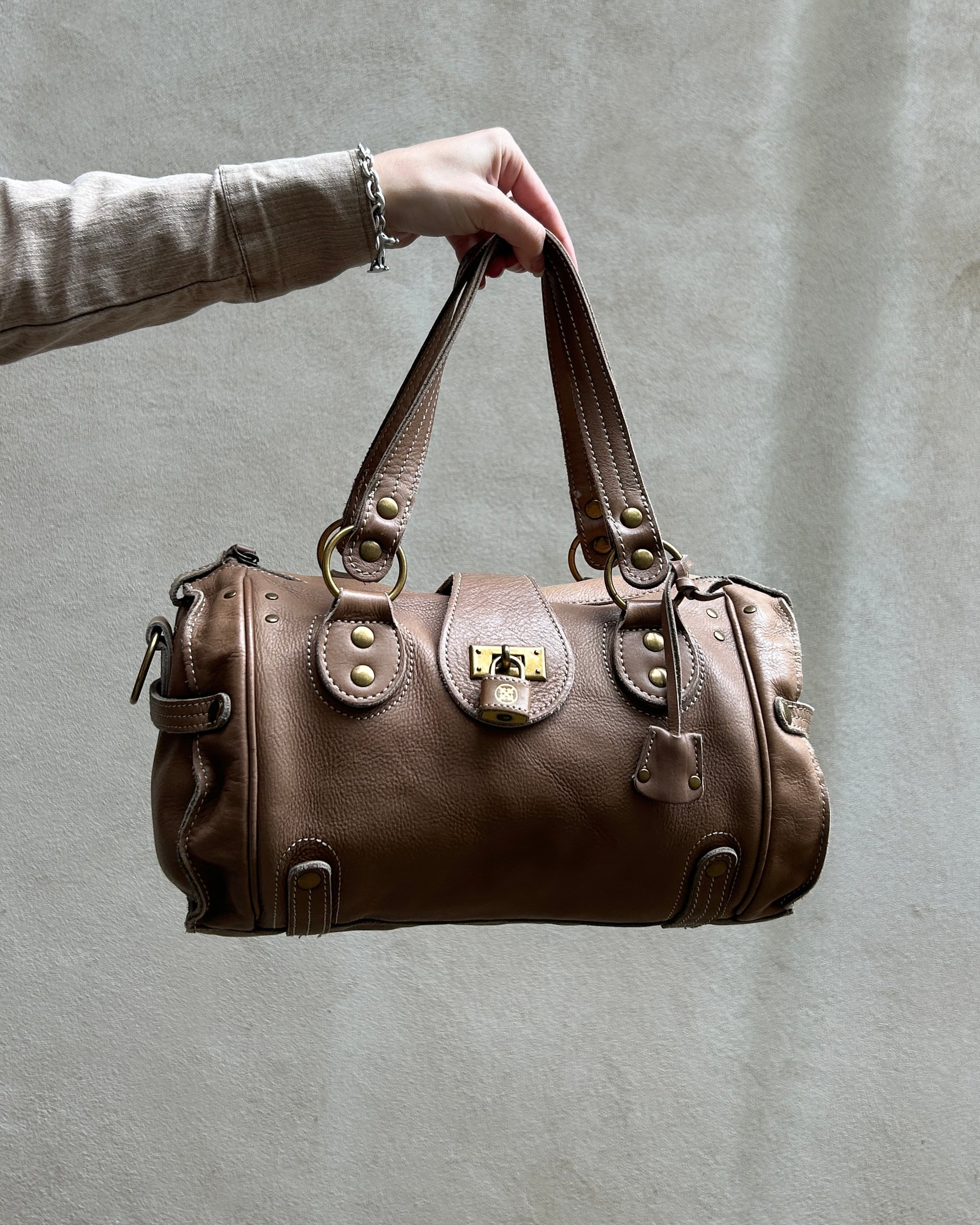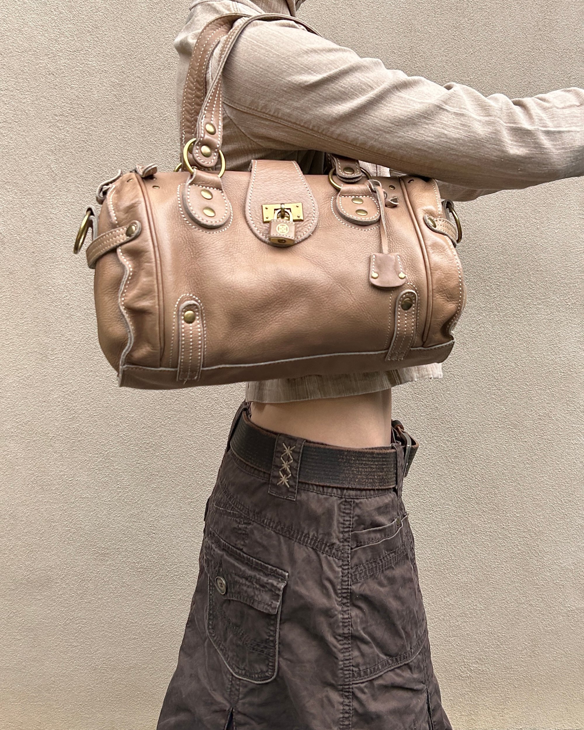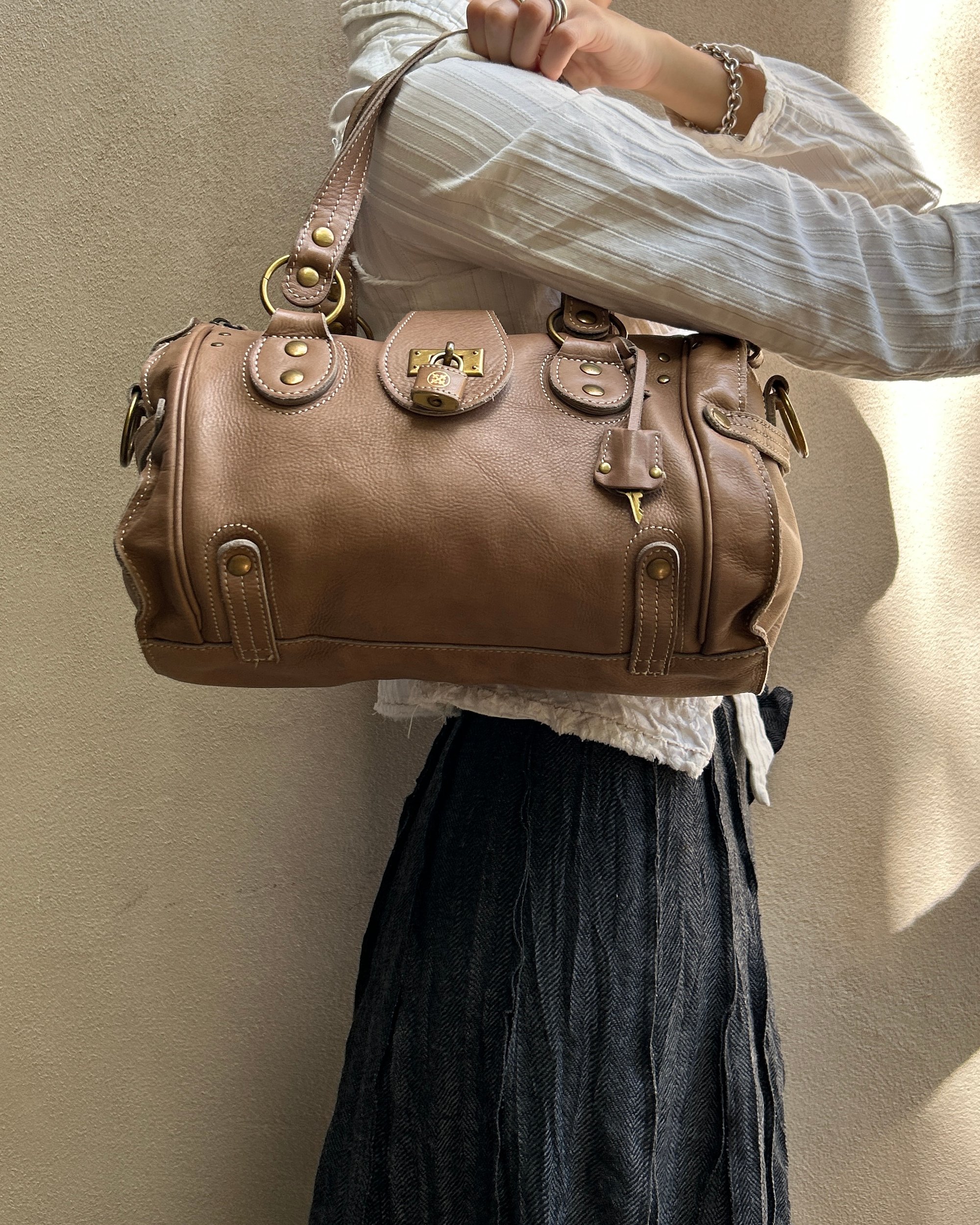 PALE BROWN | Vintage Japanese brand genuine leather shoulder bag with antique gold hardware.