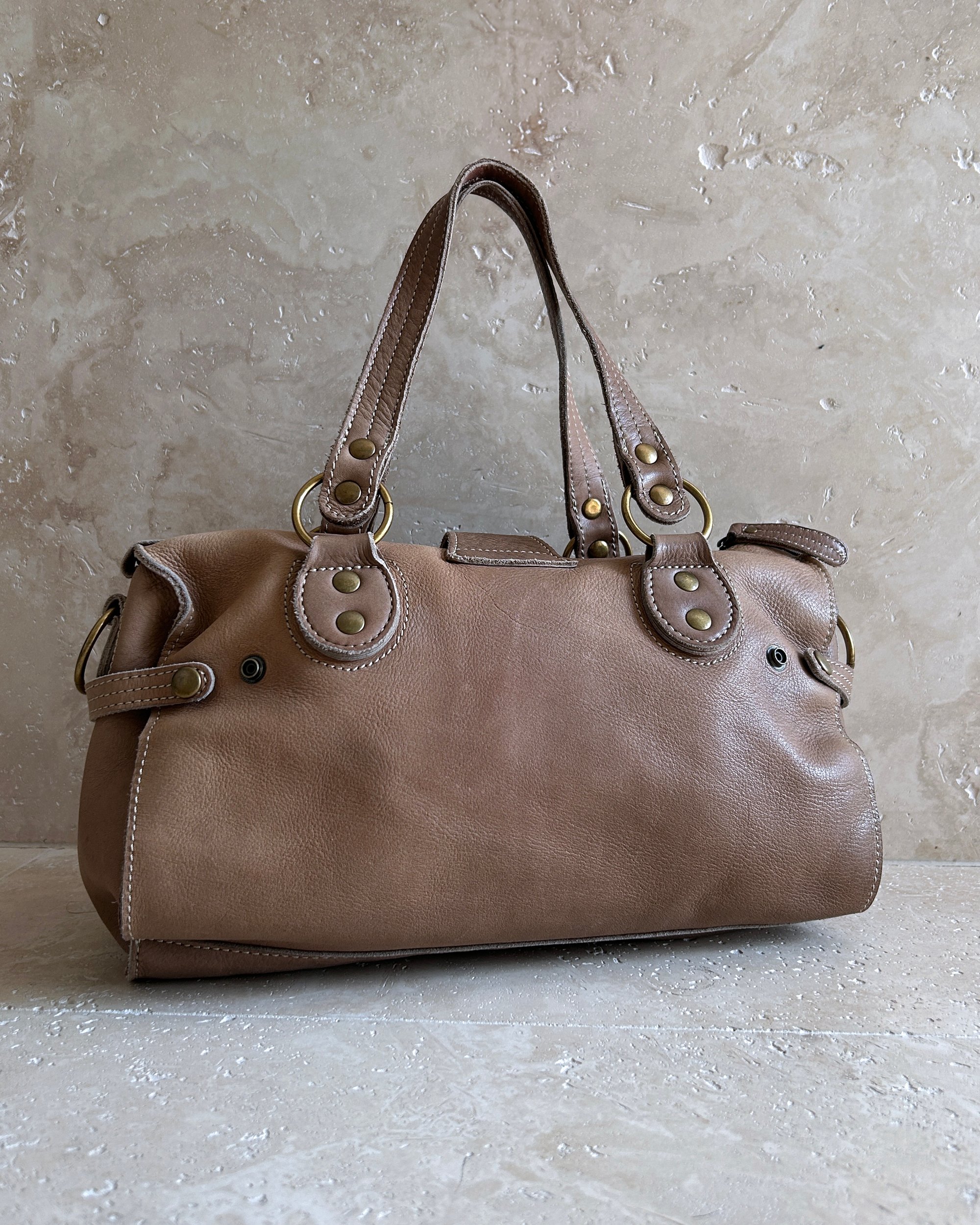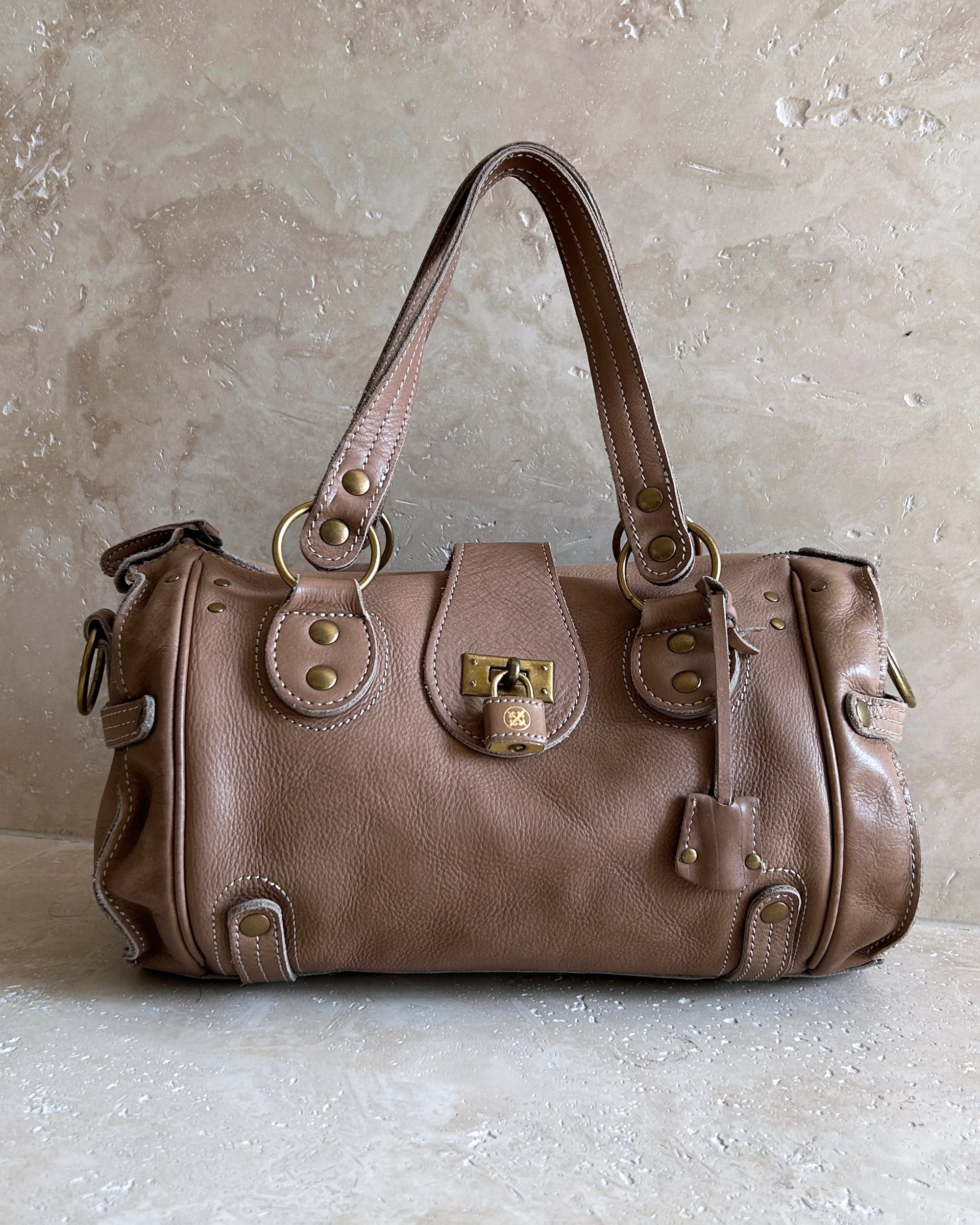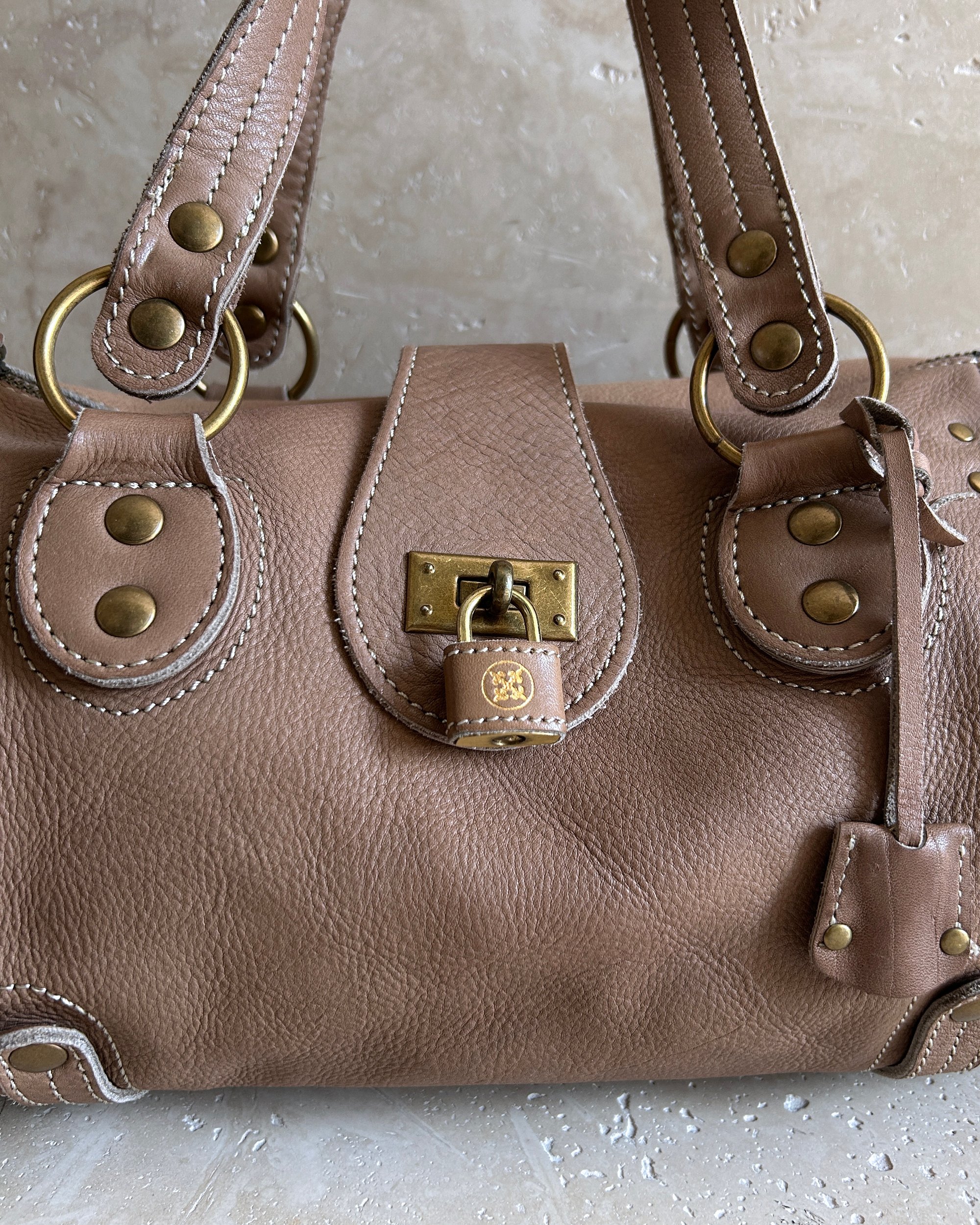 PALE BROWN | Vintage Japanese brand genuine leather shoulder bag with antique gold hardware.