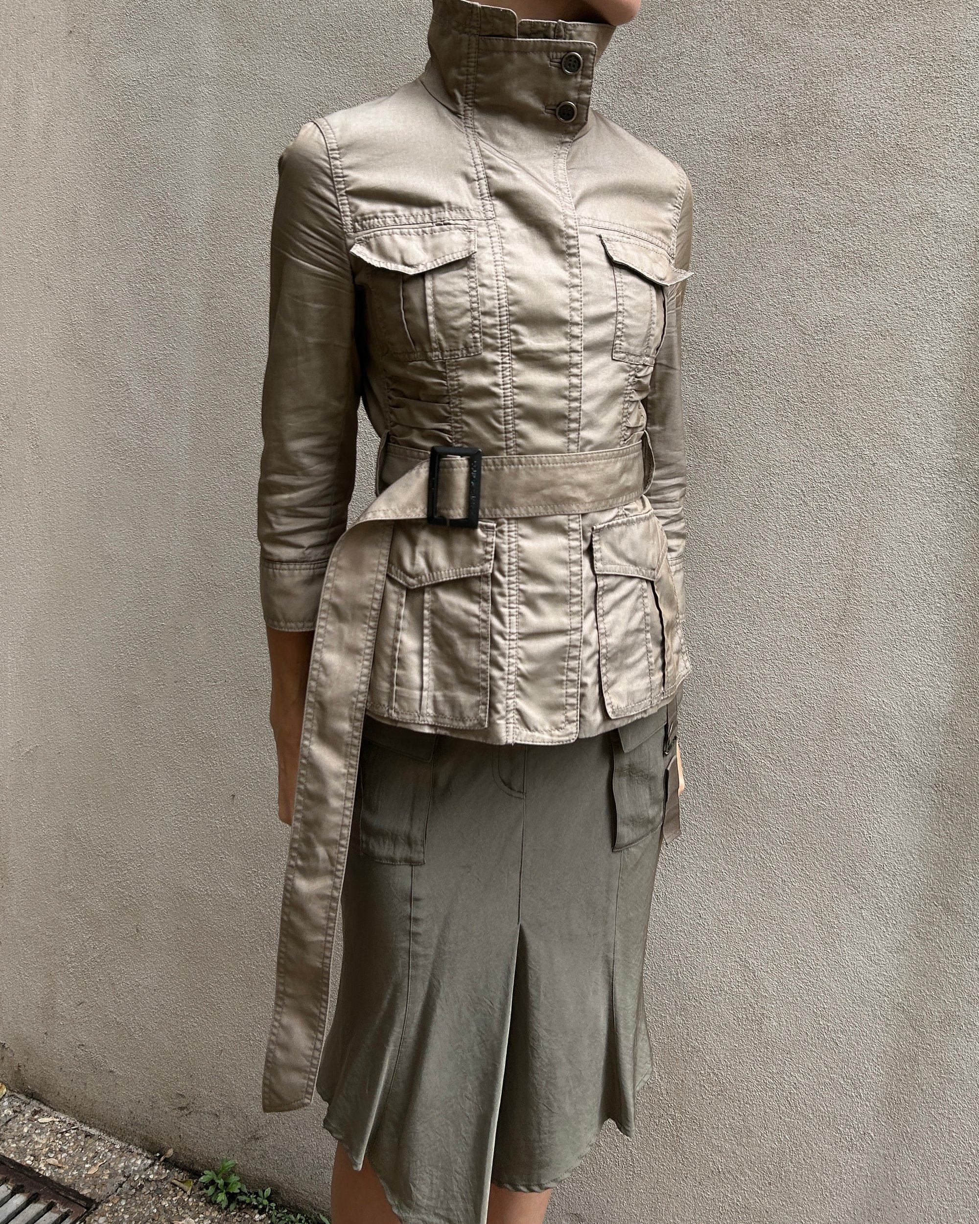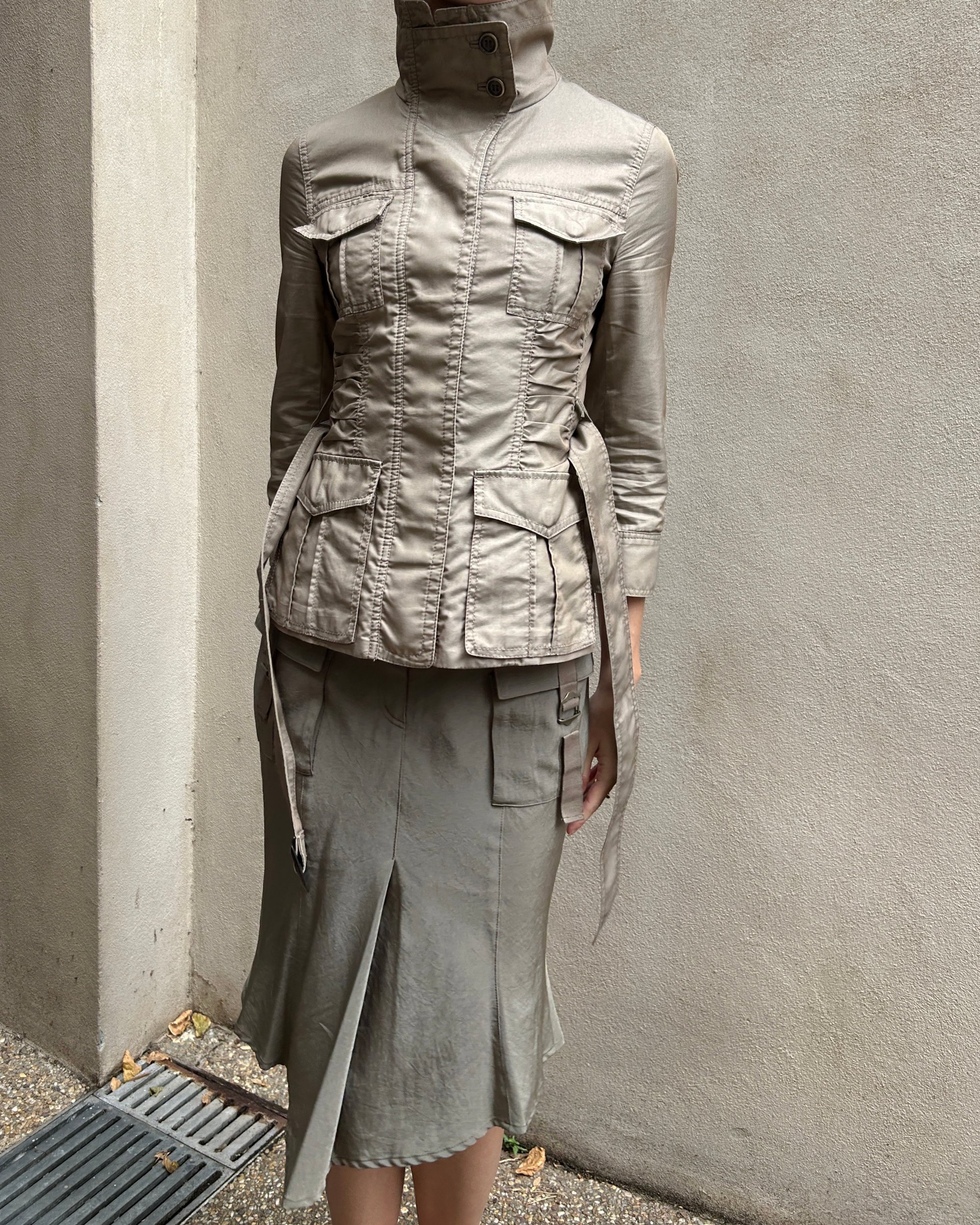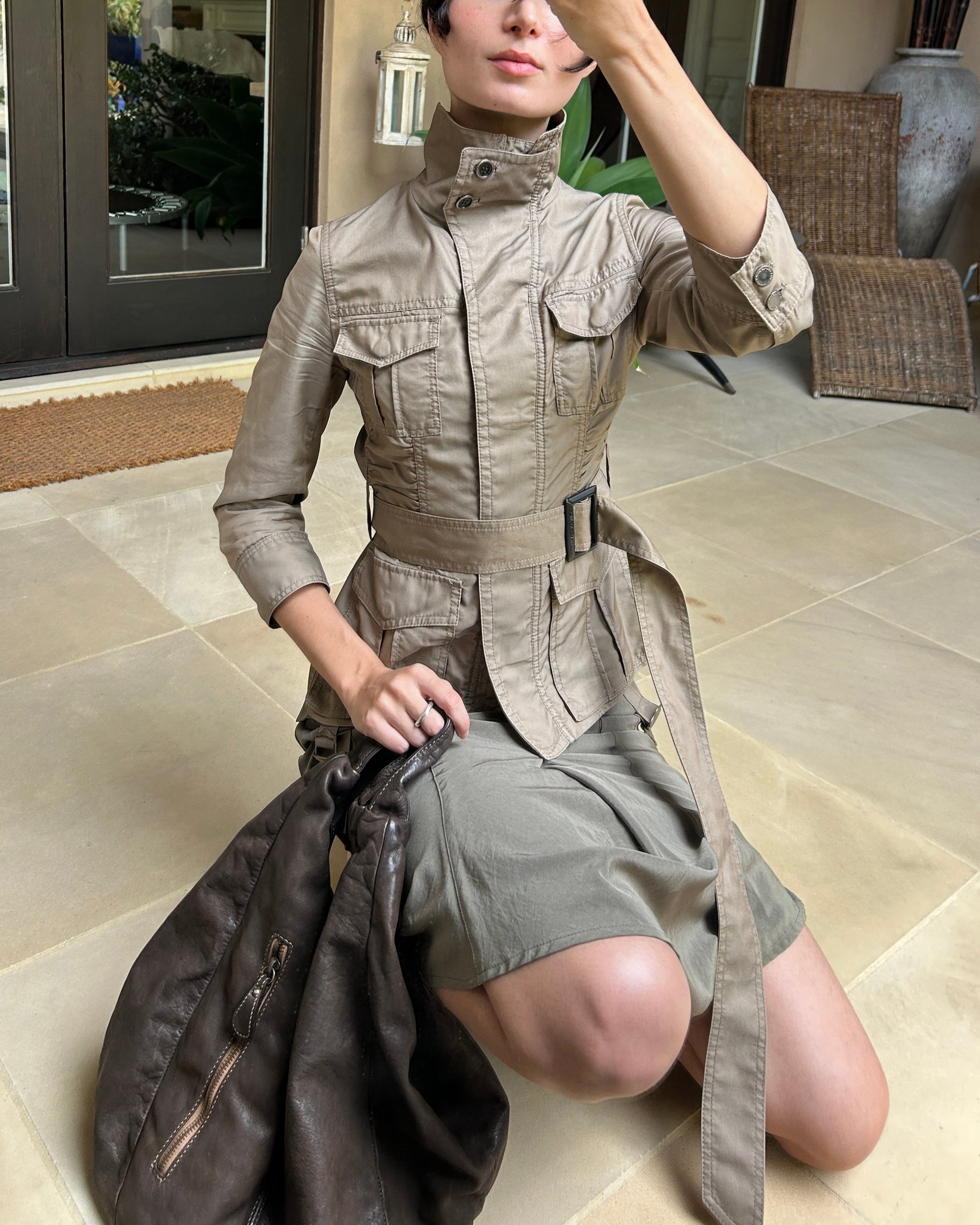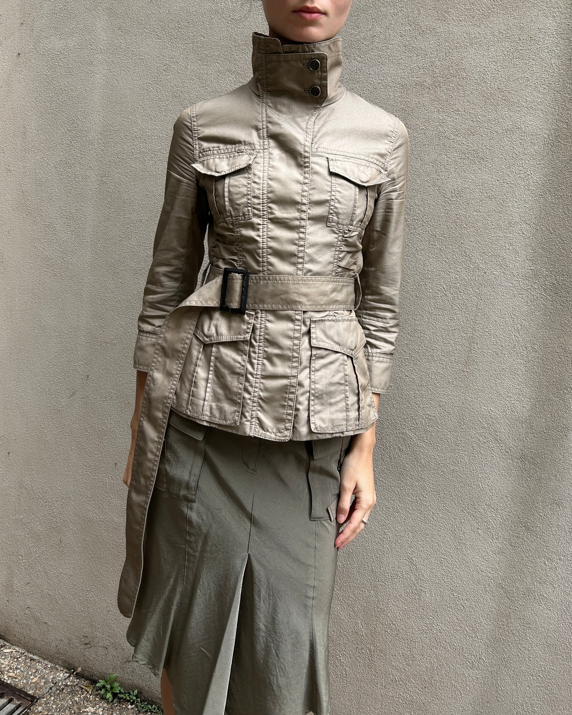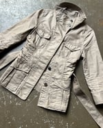 SIZE 36 | Japanese brand taupe 3/4 sleeve jacket with high collar, ruched waist and belt.