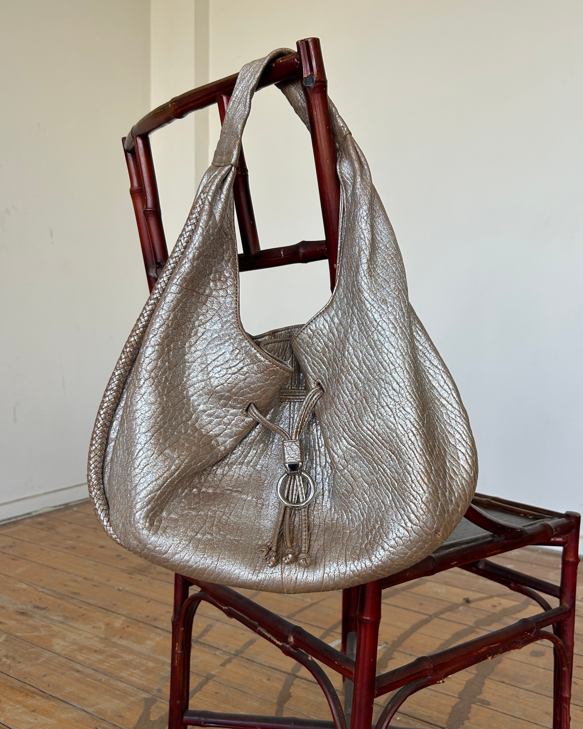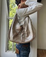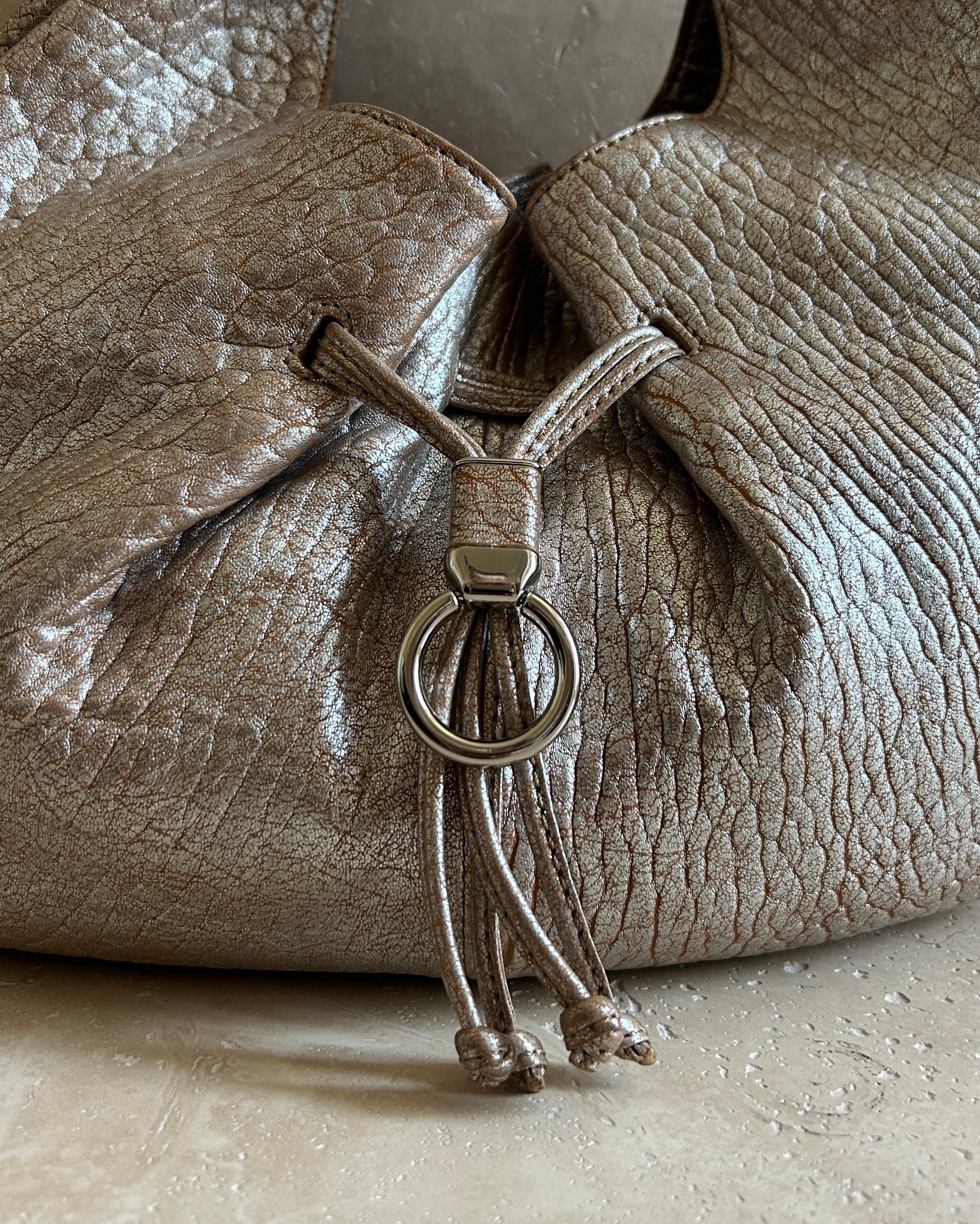 METALLIC BEIGE | Vintage Cole Haan slouchy genuine leather bag with drawstring.