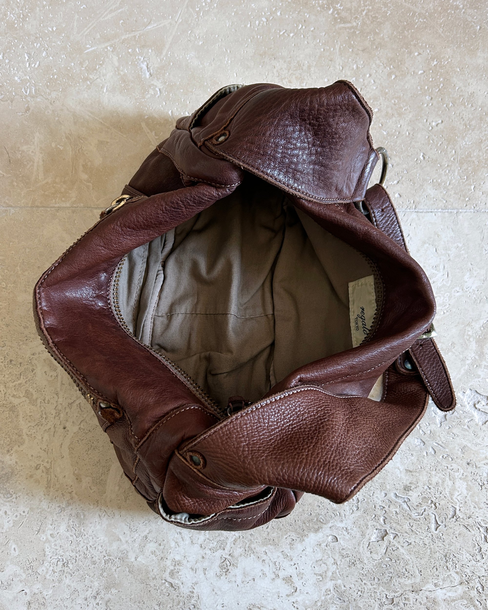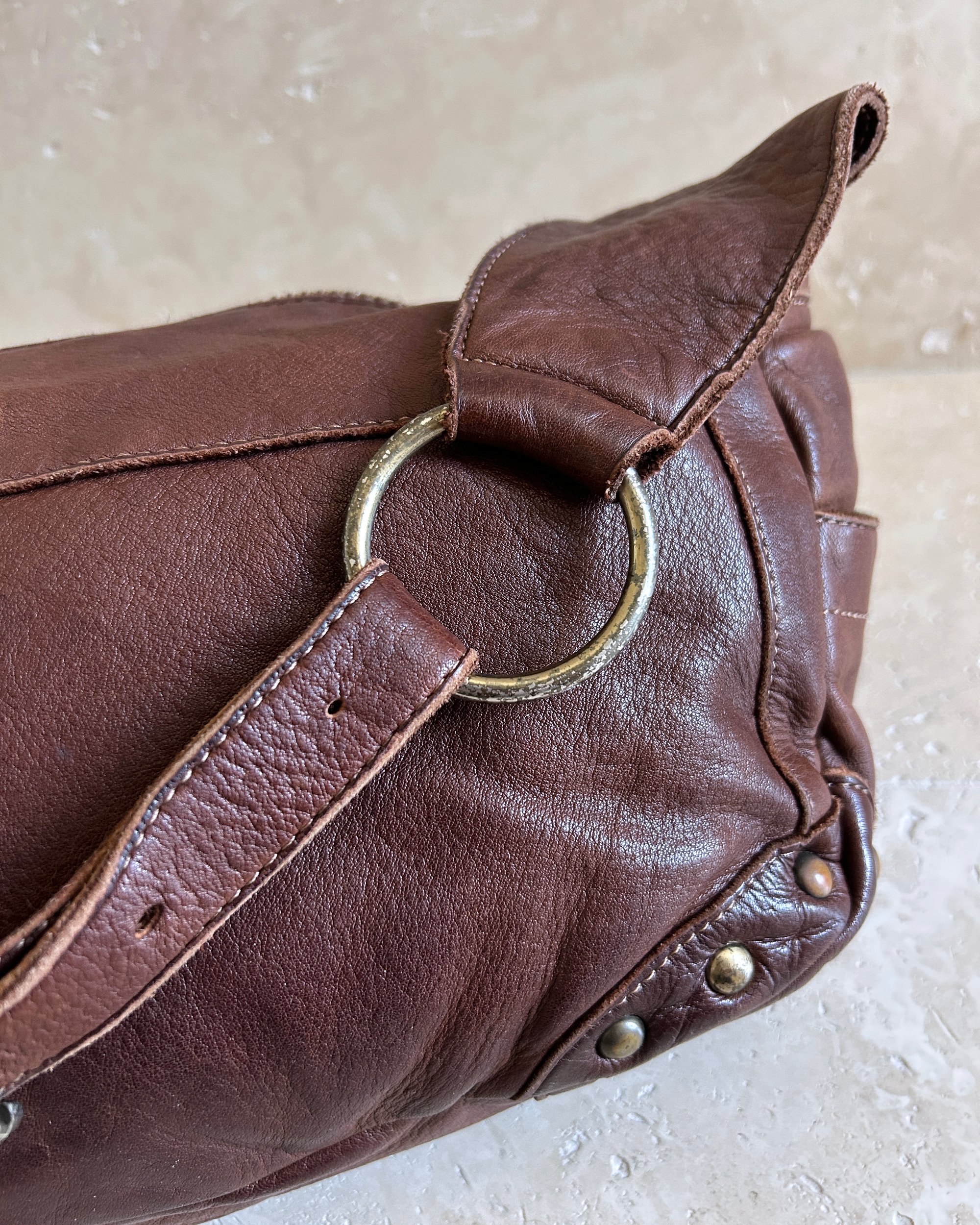 CHOCOLATE BROWN | Japanese label vintage genuine leather shoulder bag with antique gold hardware and stud detail.