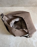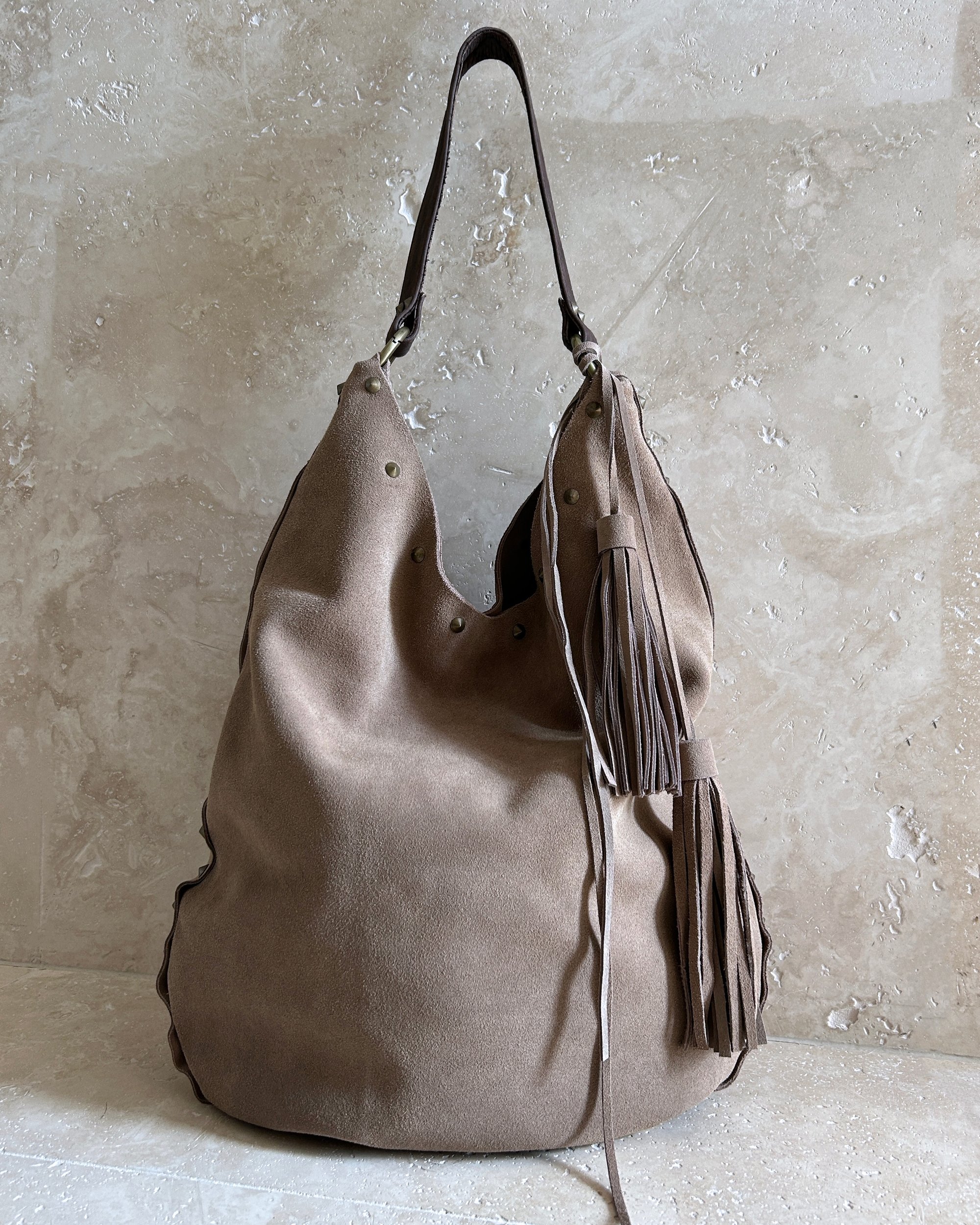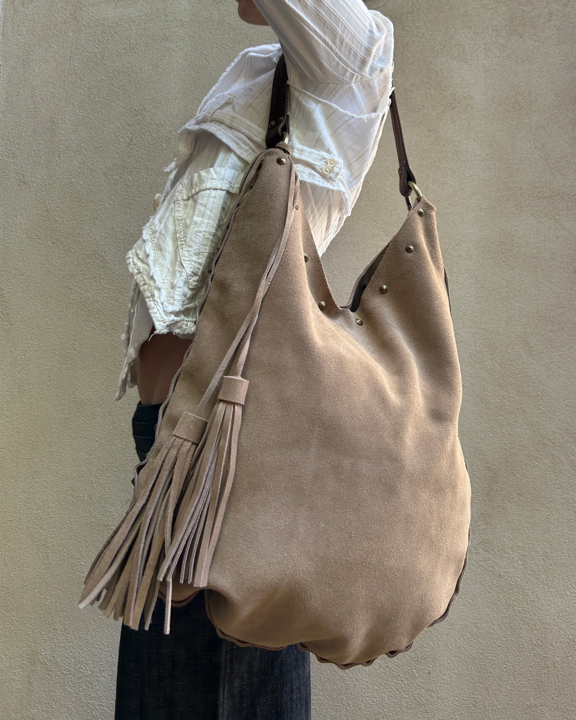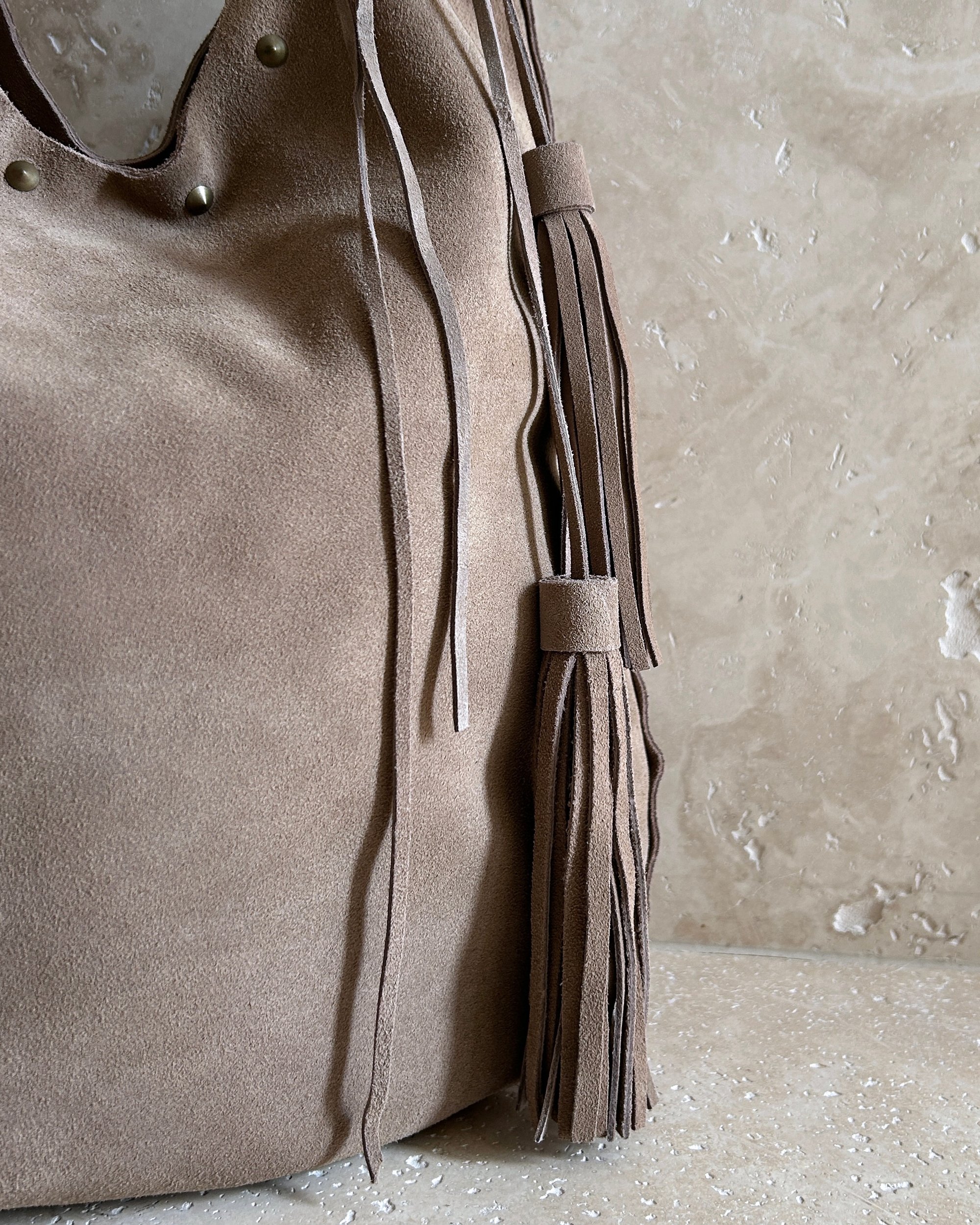 BEIGE | Vintage genuine suede leather bag with antique gold hardware and stud/tassel detail.