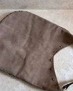 Soft suede leather. Chocolate brown leather handle. Magnetic snap closure. Tassels can be removed and tied onto the bag in multiple ways. Three inner pocket compartments. Beige lining.