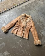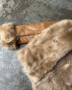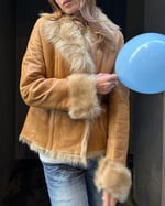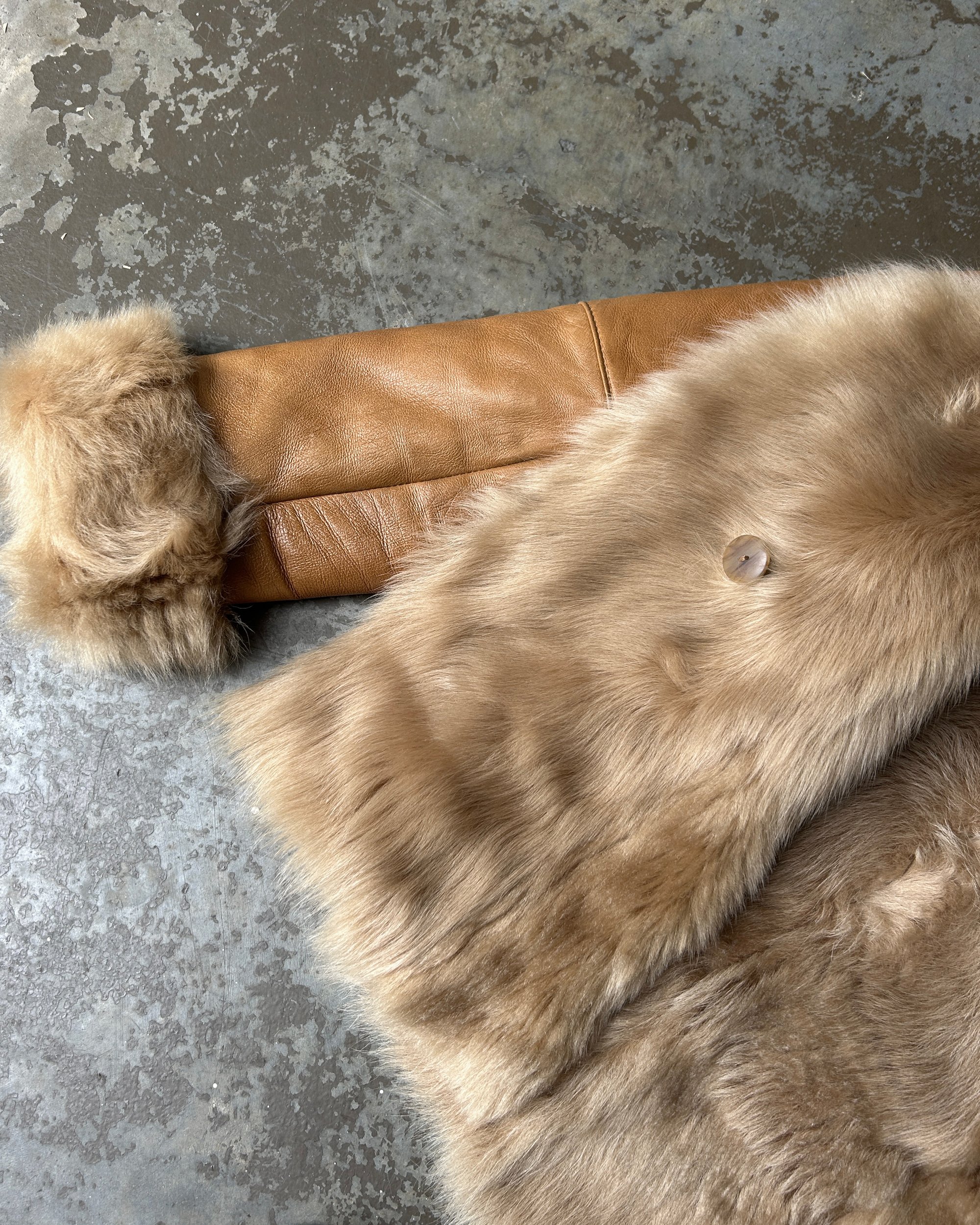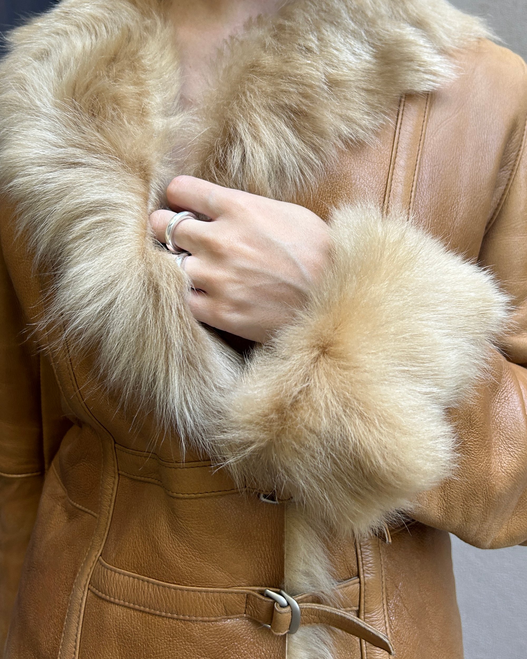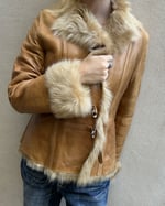 Soft genuine leather. Fully lined with real mouton fur. Concealed button and buckle closure. Pictured on a size 6.
