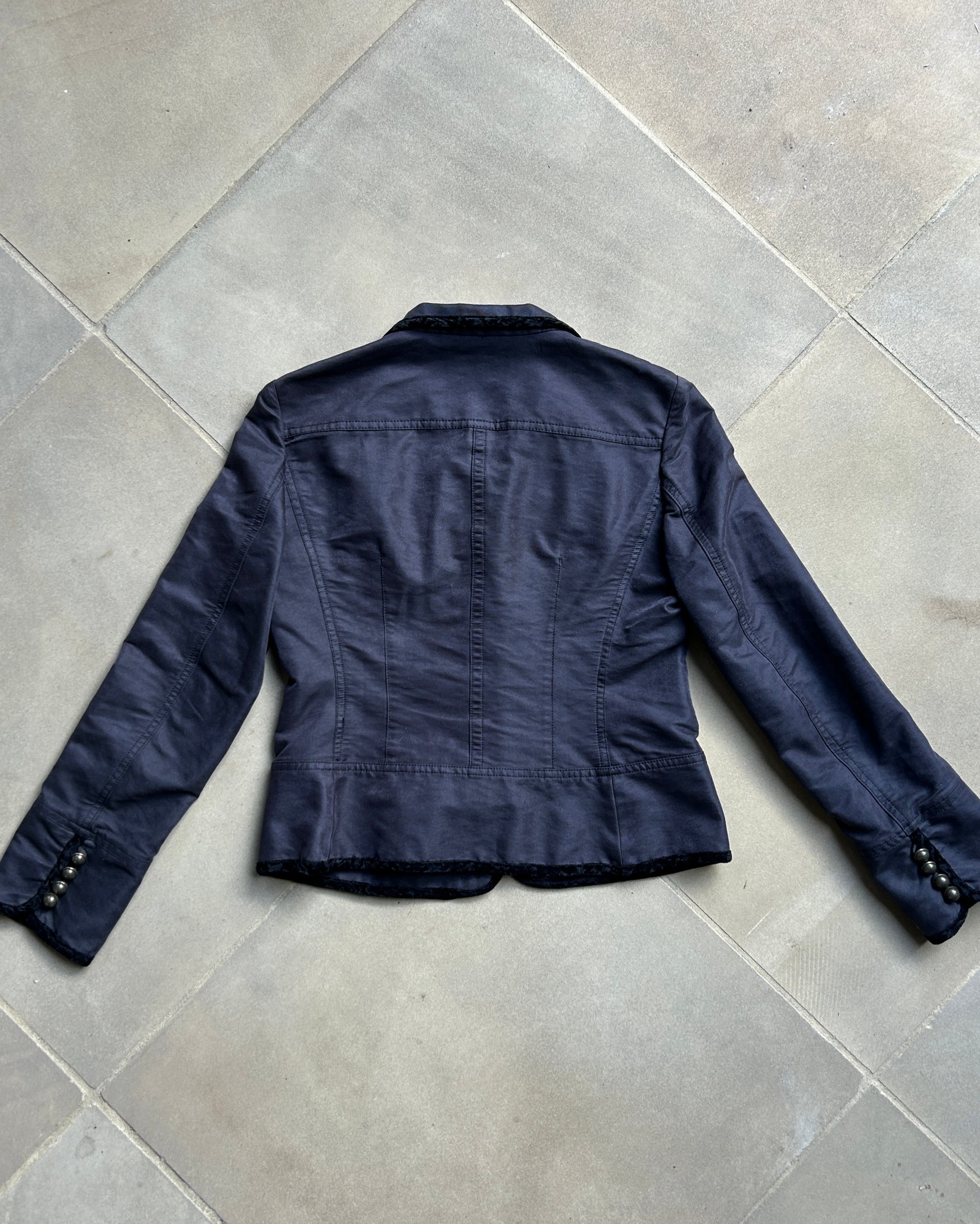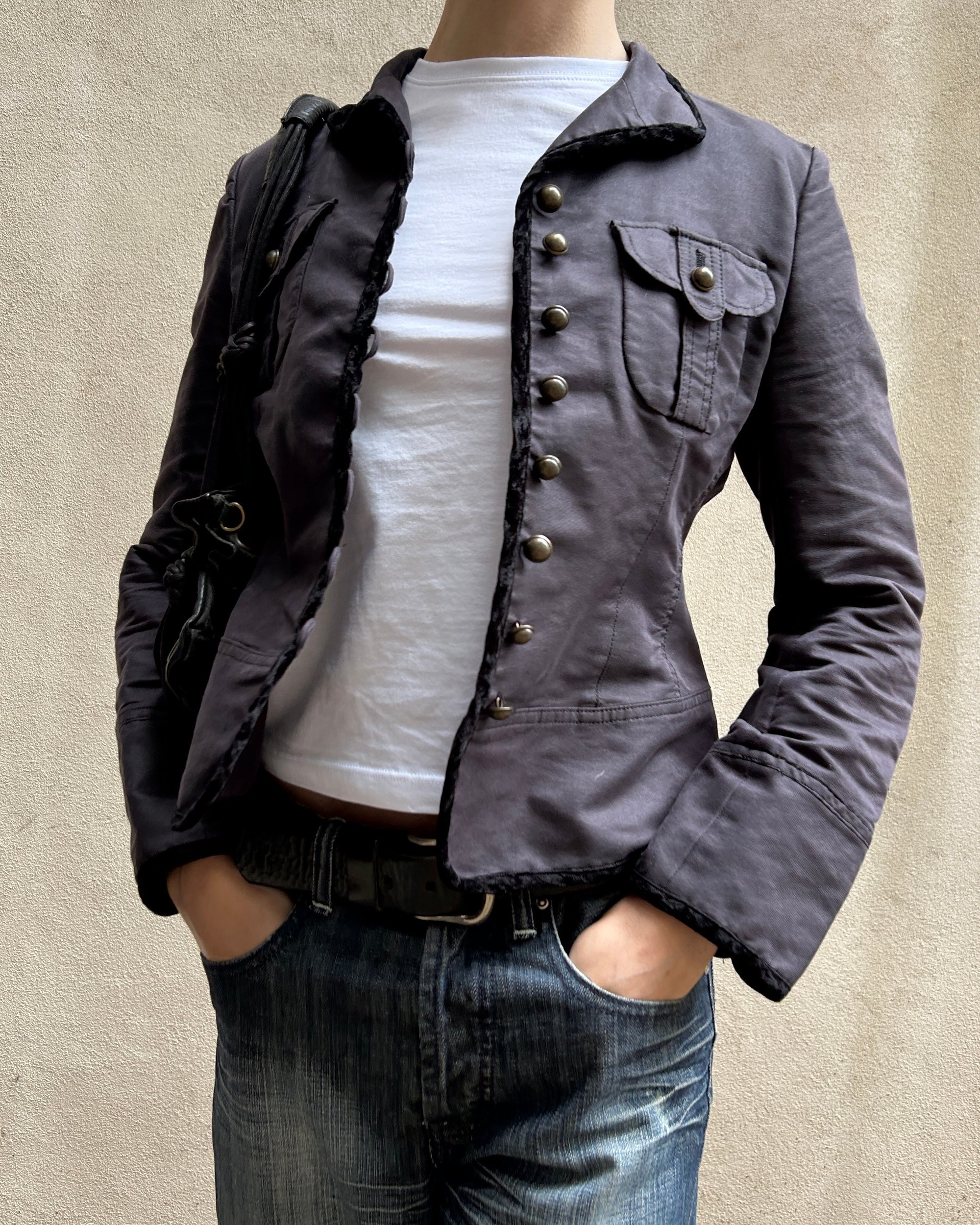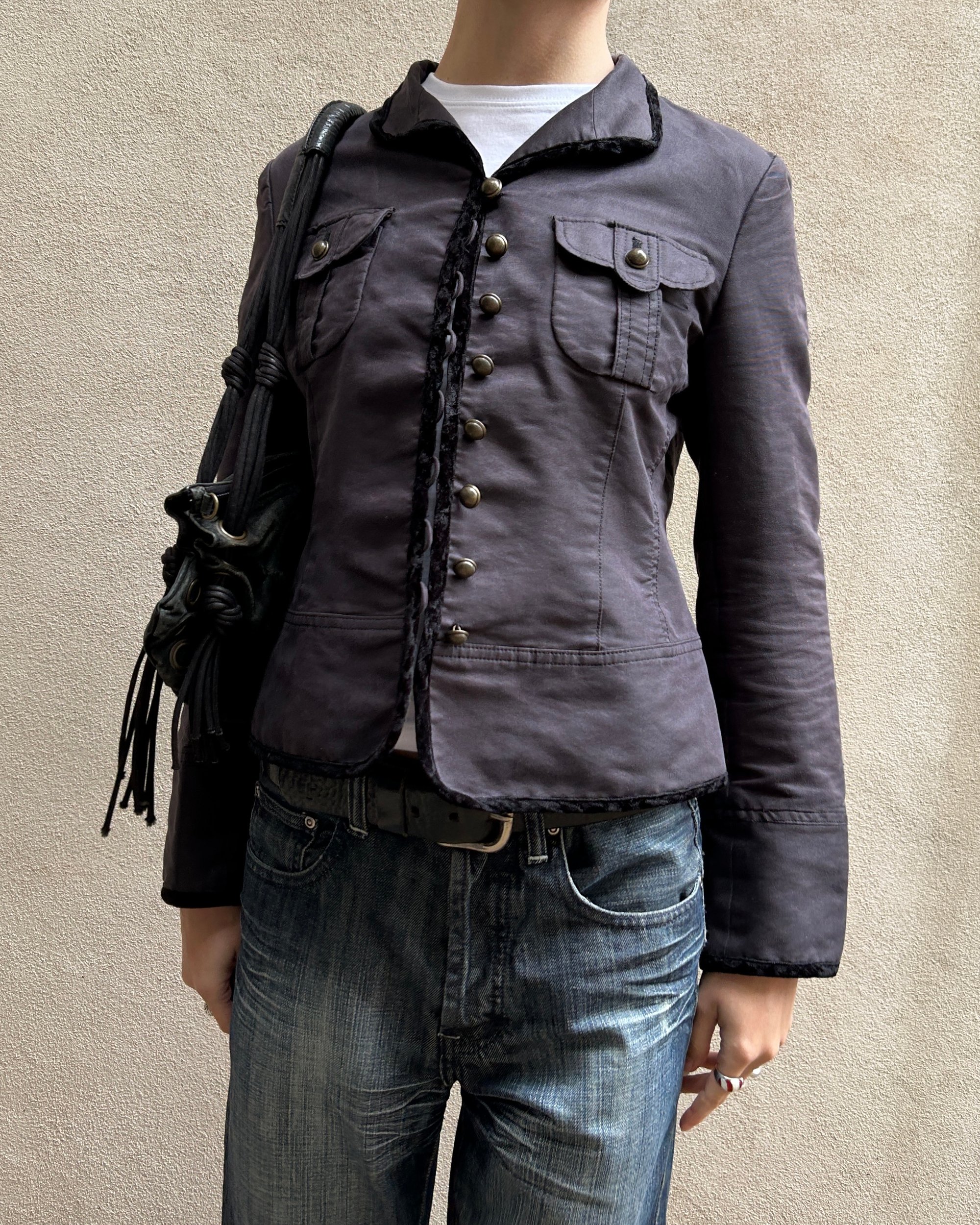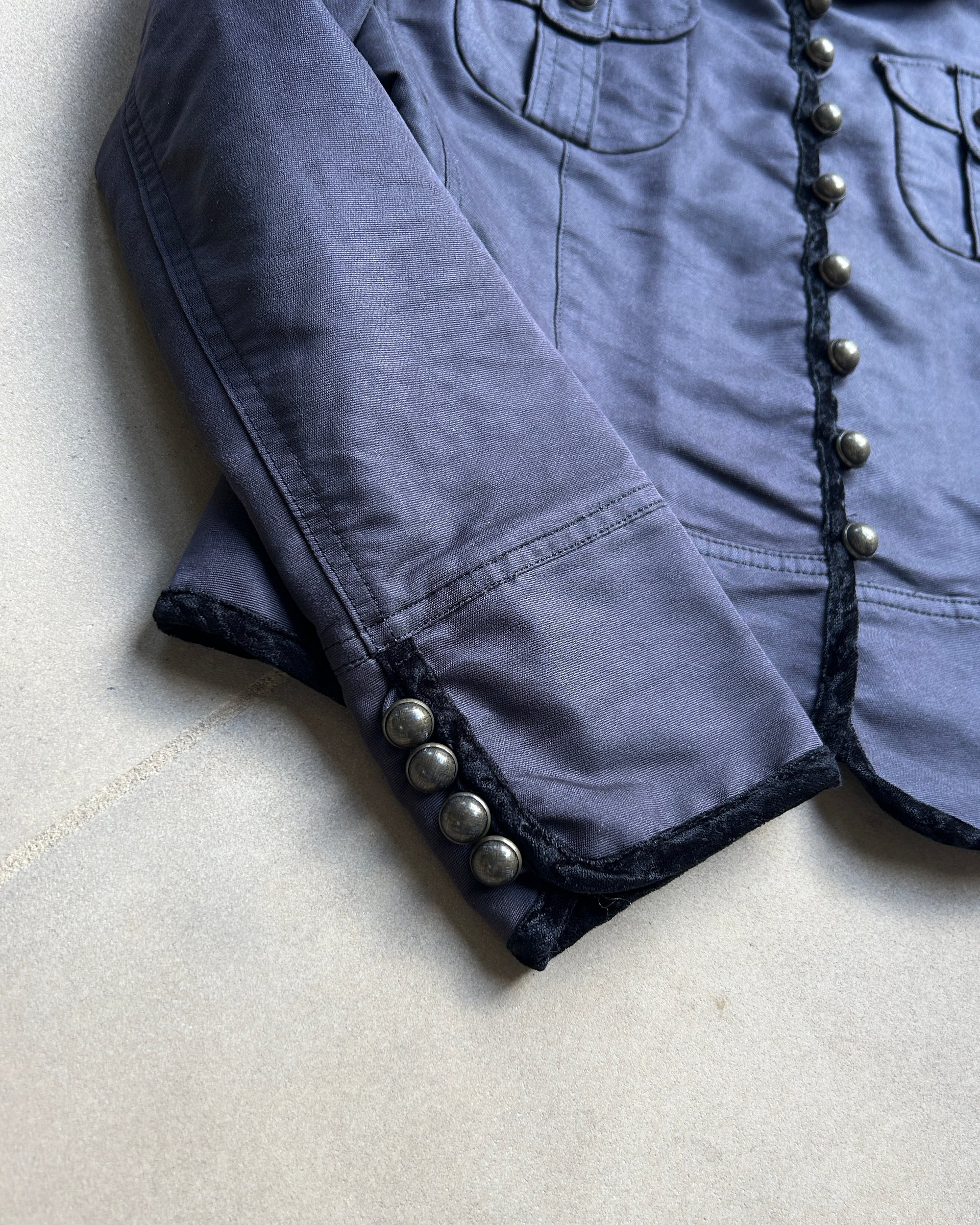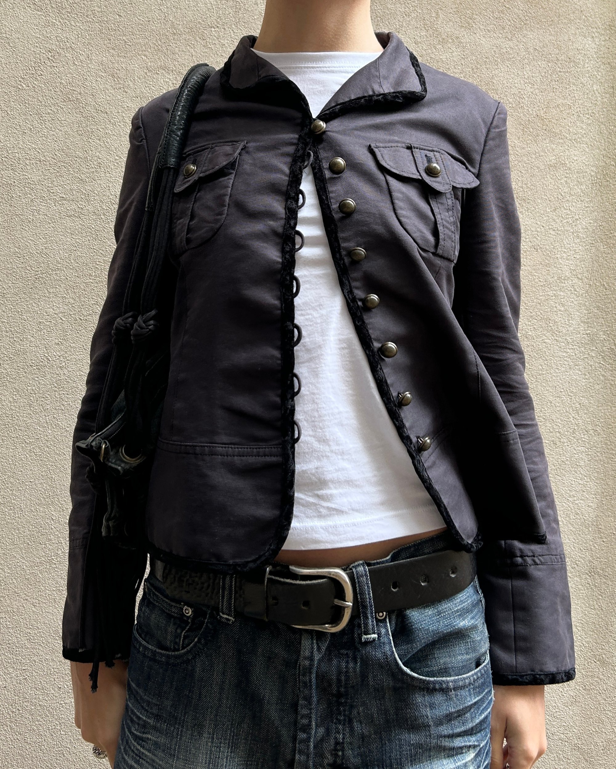 SIZE 11/S | Japanese label black military style jacket with antique gold buttons and velvet trim.