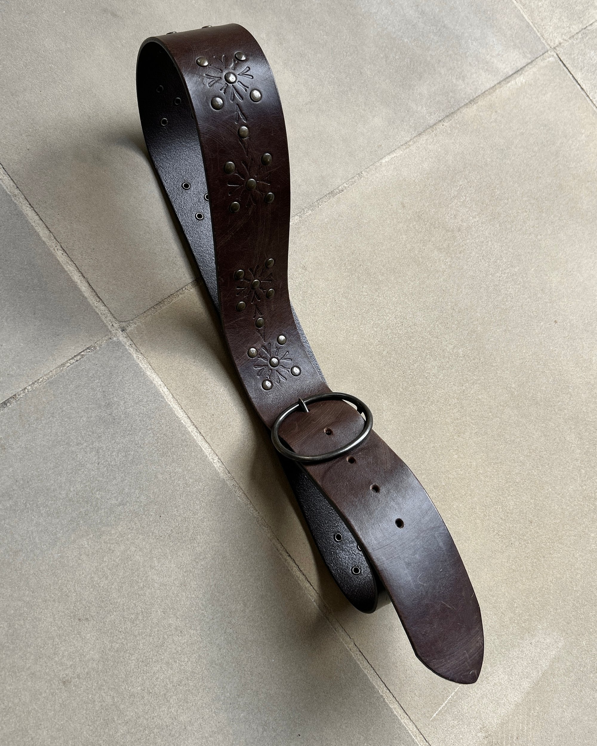SIZE L / 36" - 40" | Vintage genuine leather Country Road Italian-made belt with antique gold buckle and studs.
